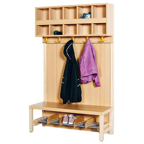 Unsere Komplettgarderoben sind infolge der Fertigung aus lackierten Stützen- und Bankgestellrahmen, 4x4 cm massiven Buche-Holzstollen sehr robust und dauerhaft. Die Garderobenstützen haben wandseitig eine Ausklinkung für Sockelleisten. Zwischen den Garderobenstützen ist flächig eine Paneelrückwand montiert. Die Ablagen aus melaminbeschichteter Spanplatte haben 15 und 17 cm hohe Fächer sowie eine Bilderleiste. Unter der Fachablage sind in Anzahl der Plätze farbige drehbare Dreifachhaken montiert.
