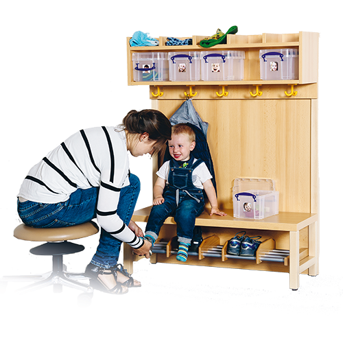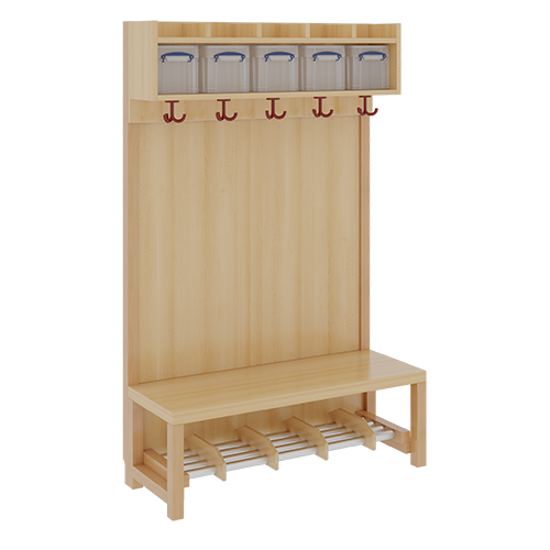 Unsere Komplettgarderoben sind infolge der Fertigung aus lackierten Stützen- und Bankgestellrahmen, 4x4 cm massiven Buche-Holzstollen sehr robust und dauerhaft. Die Garderobenstützen haben wandseitig eine Ausklinkung für Sockelleisten. Zwischen den Garderobenstützen ist flächig eine Paneelrückwand montiert. In den Fachablagen aus melaminbeschichteter Spanplatte stehen Boxen mit Deckel und darüber 5 cm hohe Ablagen. Unter der Fachablage sind in Anzahl der Plätze farbige drehbare Dreifachhaken montiert. Die Sitzfläche besteht ebenfalls aus stabiler melaminbeschichteter Spanplatte, das Dekor ist wählbar. Darunter befindet sich ein Schuhrost aus mit RAL 9006 pulverbeschichteten robusten Aluminiumrohren.