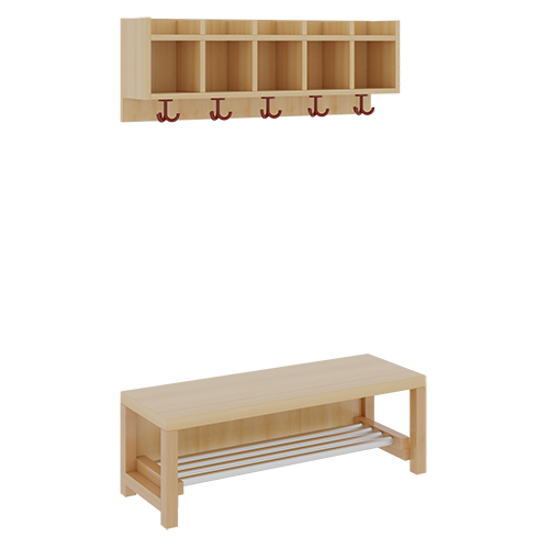 Unsere Komplettgarderoben sind infolge der Fertigung aus lackierten Stützen- und Bankgestellrahmen, 4x4 cm massiven Buche-Holzstollen sehr robust und dauerhaft. Die Ablagen aus melaminbeschichteter Spanplatte haben 17 cm hohe Fächer und darüber 5 cm hohe Ablagen. Unter der Fachablage sind in Anzahl der Plätze farbige drehbare Dreifachhaken montiert. Die Sitzfläche besteht ebenfalls aus stabiler melaminbeschichteter Spanplatte, das Dekor ist wählbar. Unter dem Sitz befindet sich ein Schuhrost aus mit RAL 9006 pulverbeschichteten robusten Aluminiumrohren. Die Breite und damit die Anzahl der Sitzplätze sowie die gewünschte Sitzhöhe sind wählbar. Die Sitzfläche ist 35 cm tief.