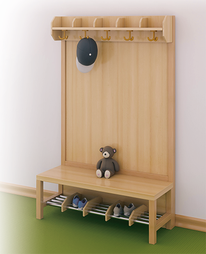 Unsere Komplettgarderoben sind infolge der Fertigung aus lackierten Stützen- und Bankgestellrahmen, 4x4 cm massiven Buche-Holzstollen sehr robust und dauerhaft. Die Garderobenstützen haben wandseitig eine Ausklinkung für Sockelleisten. Zwischen den Garderobenstützen ist flächig eine Paneelrückwand montiert. Die Ablage hat stabile Seiten aus dicken Multiplex-Platten, die Abtrennungen werden aus Massivholz gefertigt. Unter der Fachablage sind in Anzahl der Plätze farbige drehbare Dreifachhaken montiert.