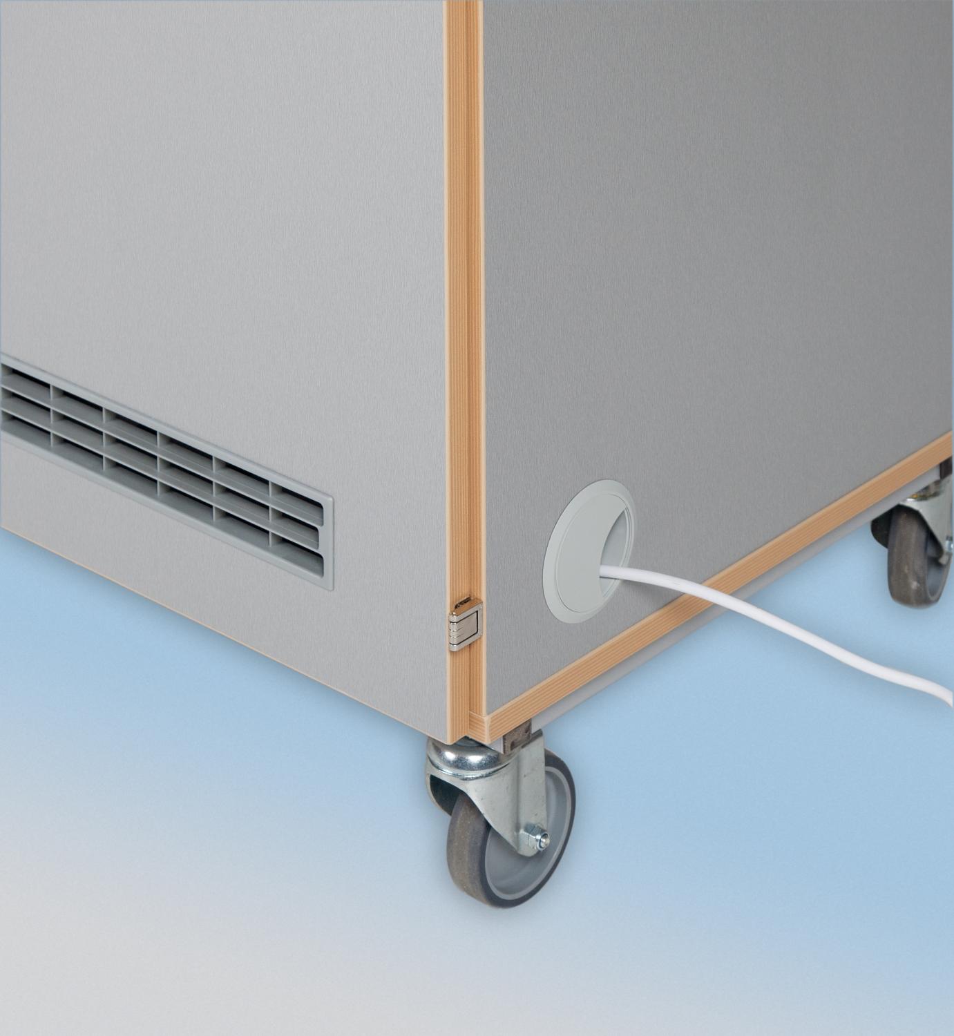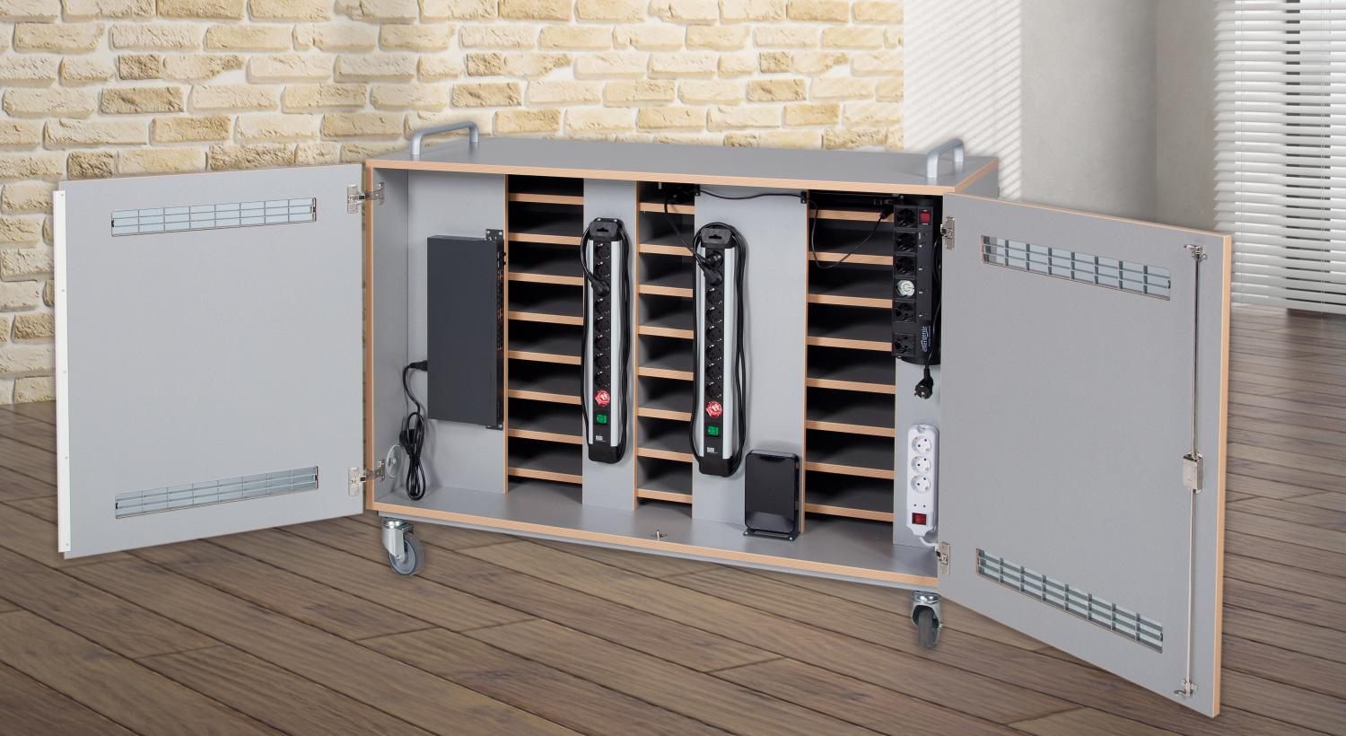 Der Laptopwagen hat abschließbare Türen vorne und hinten. Er bietet Platz für 16 Laptops oder 32 Tablet PCs. Steckdosenleisten sind im Laptopwagen eingebaut, so dass die Laptops im Schrank geladen werden können und nur ein Kabel nach draußen geführt wird. Mehrere Lüftungsgitter an der Rückseite sorgen für eine ausreichende Luftzirkulation. Die Innenfächer sind passend für Geräte bis zu 17 Zoll.