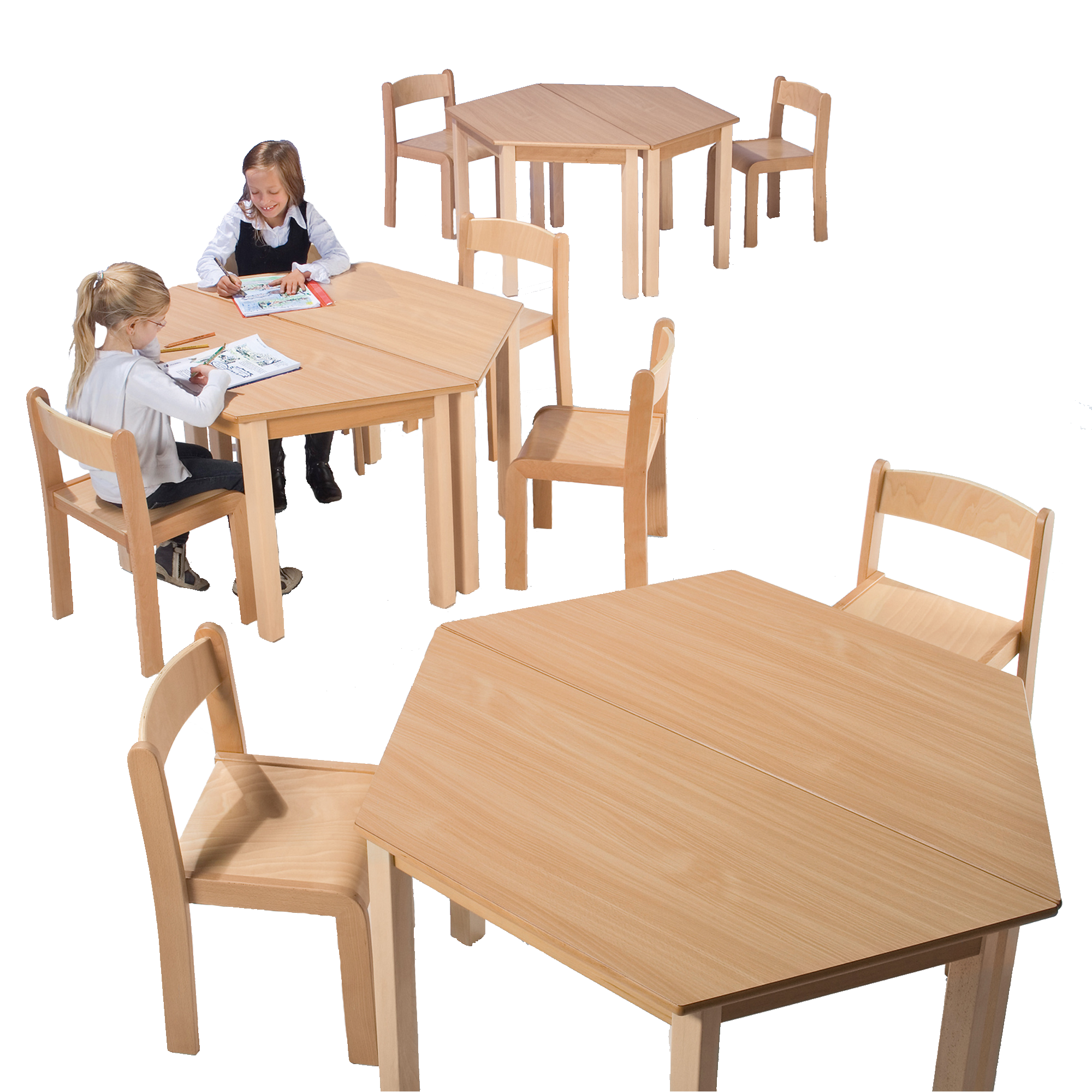 Beine und Zargenrahmen dieser Tische sind aus massivem Buchenholz gefertigt. Die trapezförmigen Tischplatten sind 19 mm stark und beidseitig mit Schichtstoff belegt, die Kante besteht aus einem tonnenförmig gerundeten Buche-Massivholzeinleimer. Die sehr widerstands- und strapazierfähige Beschichtung eignet sich hervorragend für den Einsatz im Kindergartenbereich.
