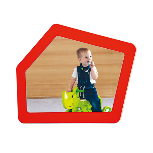 Ein Spiegel-5-Eck in der Größe B/H: 90x70 cm, der Spiegel hängt im Querformat: hier können alle Spiegeleien nebeneinander stattfinden! Die Spiegelfläche ist an die Grundplatten-Kontur angepasst, der Abstand beträgt allseitig ca. 8 cm.