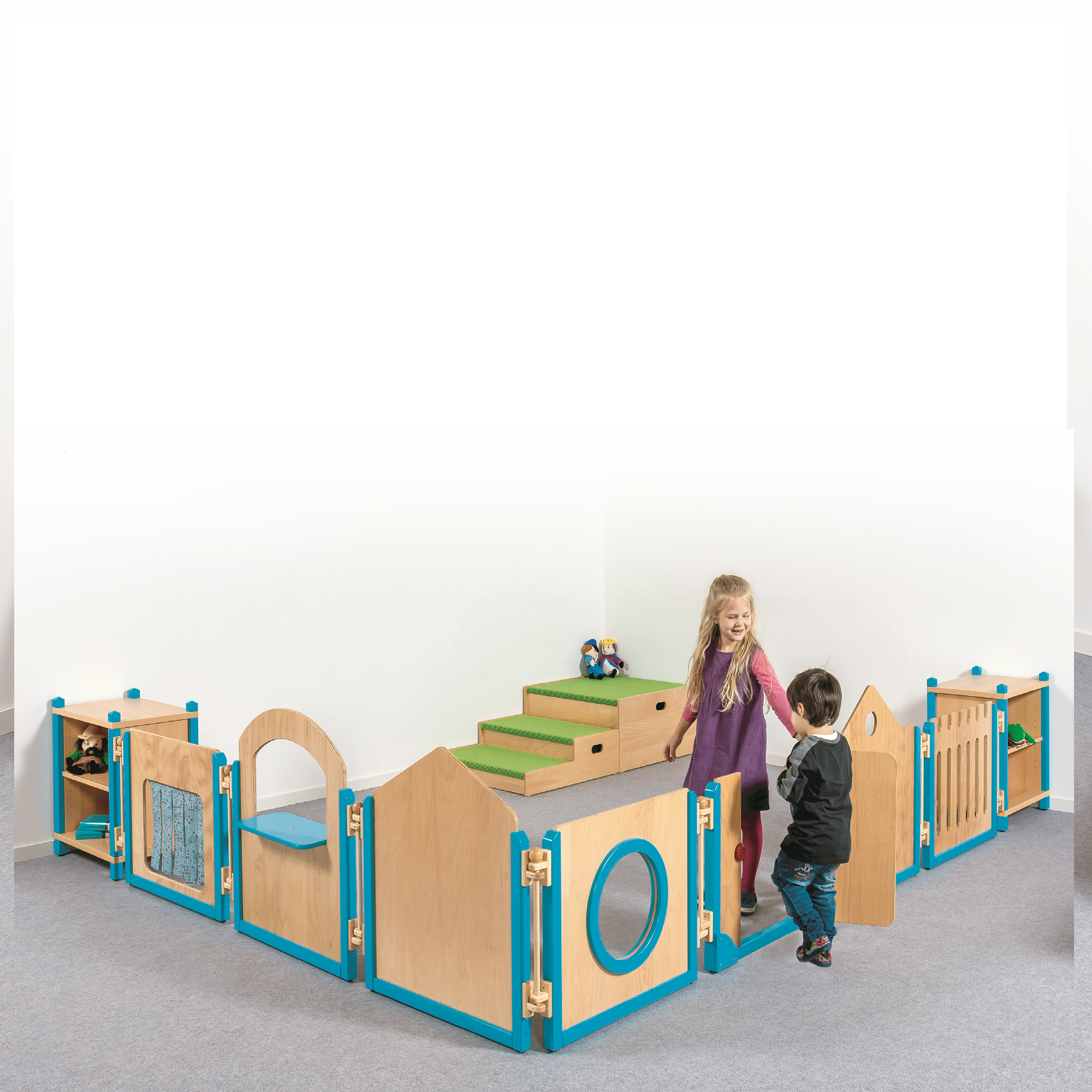 Raumteiler schaffen abgetrennte Spielzonen und Erlebnisräume. Dank verschiedener Motive und Nutzungsmöglichkeiten, lassen sie sich schnell und flexibel zu spannenden Kinderwelten mit unterschiedlichen Eingängen und Durchschlüpfen kombinieren. Verbinder dienen zur Montage der Elemente untereinander und dem Anschluss an weitere Möbel oder die Wand. Sie ermöglichen ein Aufstellen in Reihe und das Weiterbauen "um die Ecke". Bei der Gestaltung der Rahmen kann zwischen naturlackiert oder farbig abgesetzt gewählt werden.