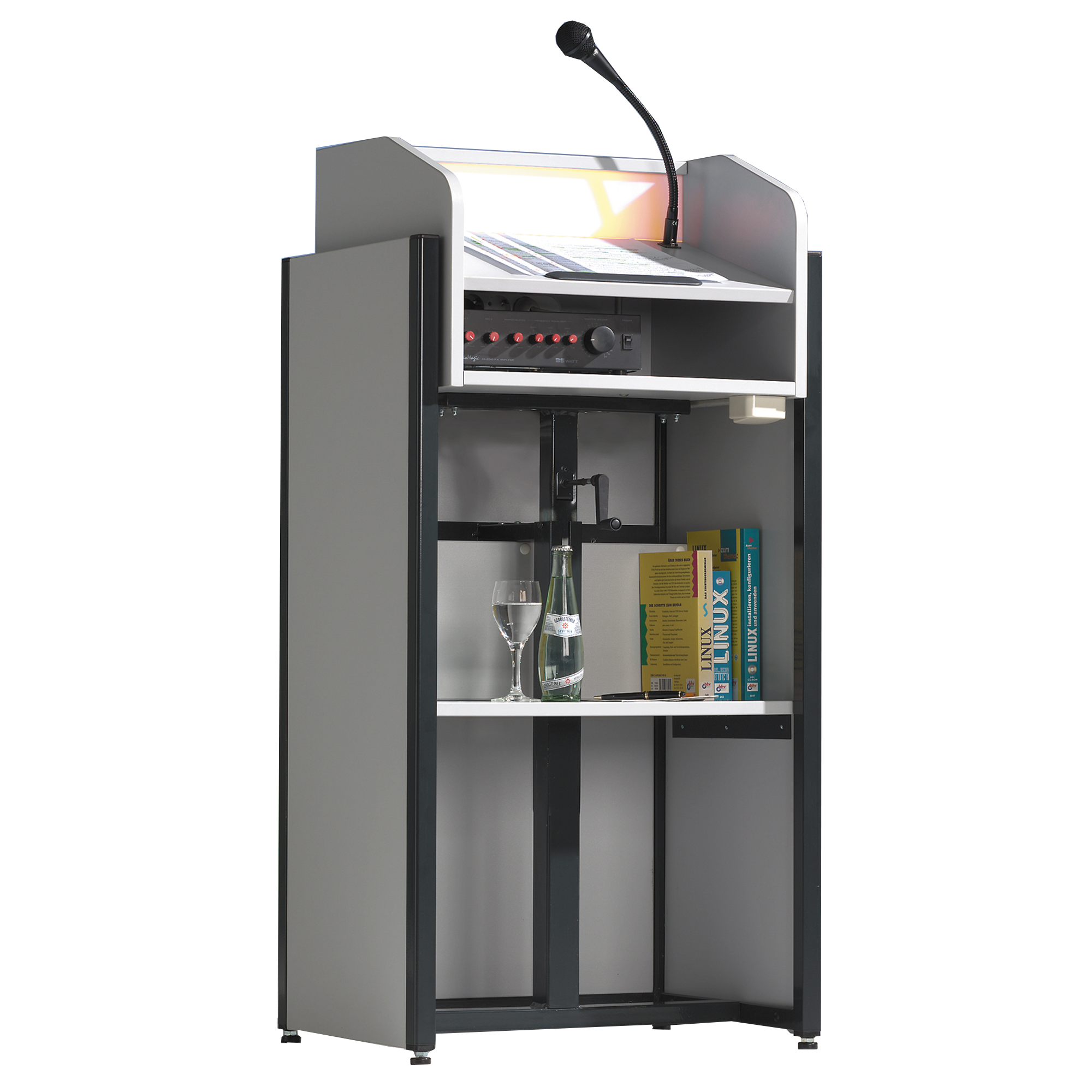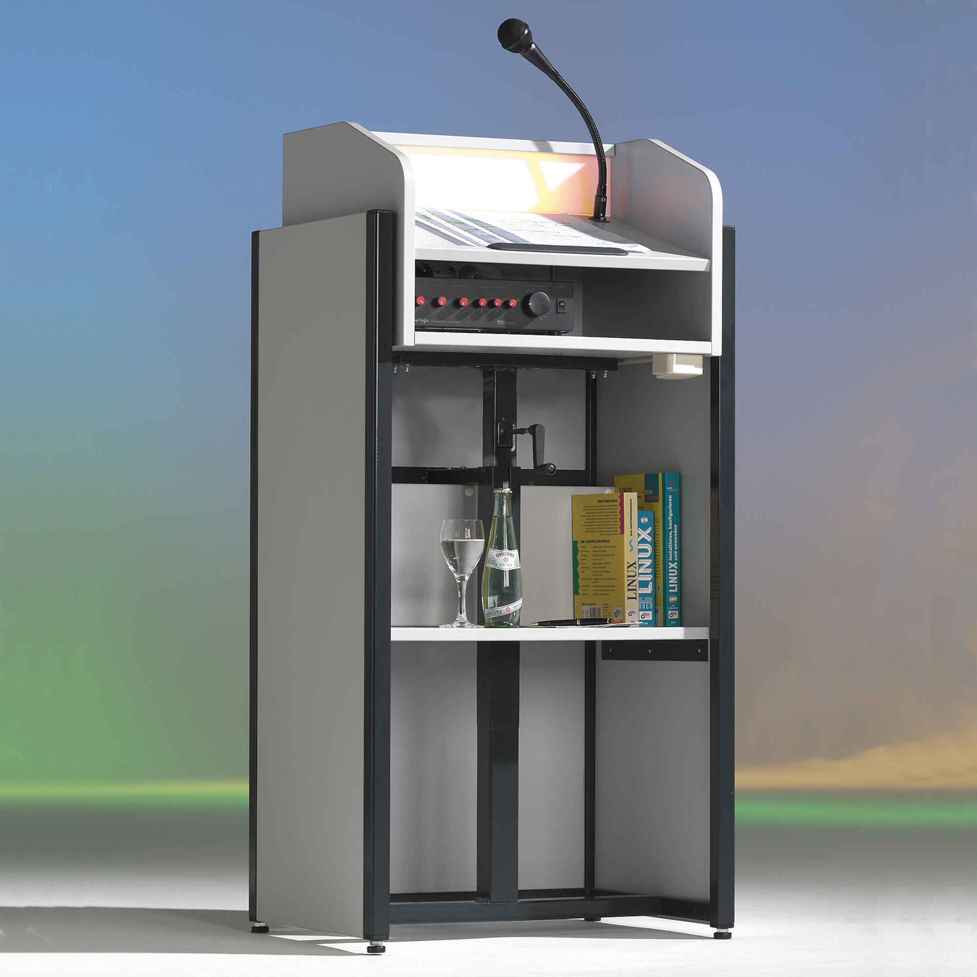 Rednerpult mit höhenverstellbarem Oberteil und blendfreier Beleuchtung. Gestell aus Stahlprofilrohr mit Stellfüßen zum Ausgleich von Bodenunebenheiten, dreiseitige Verblendung aus Dreischicht-Feinspanplatte 19 mm, melaminharzbeschichtetes Dekor. Oberteil mit schräggestellter Manuskriptablage mit vorderer Acrylglasaufkantung, darunter geräumiges Ablagefach. Oberteil mittels Kurbelmechnismus stufenlos höhenverstellbar im Bereich von 100-128 cm (Oberkante).