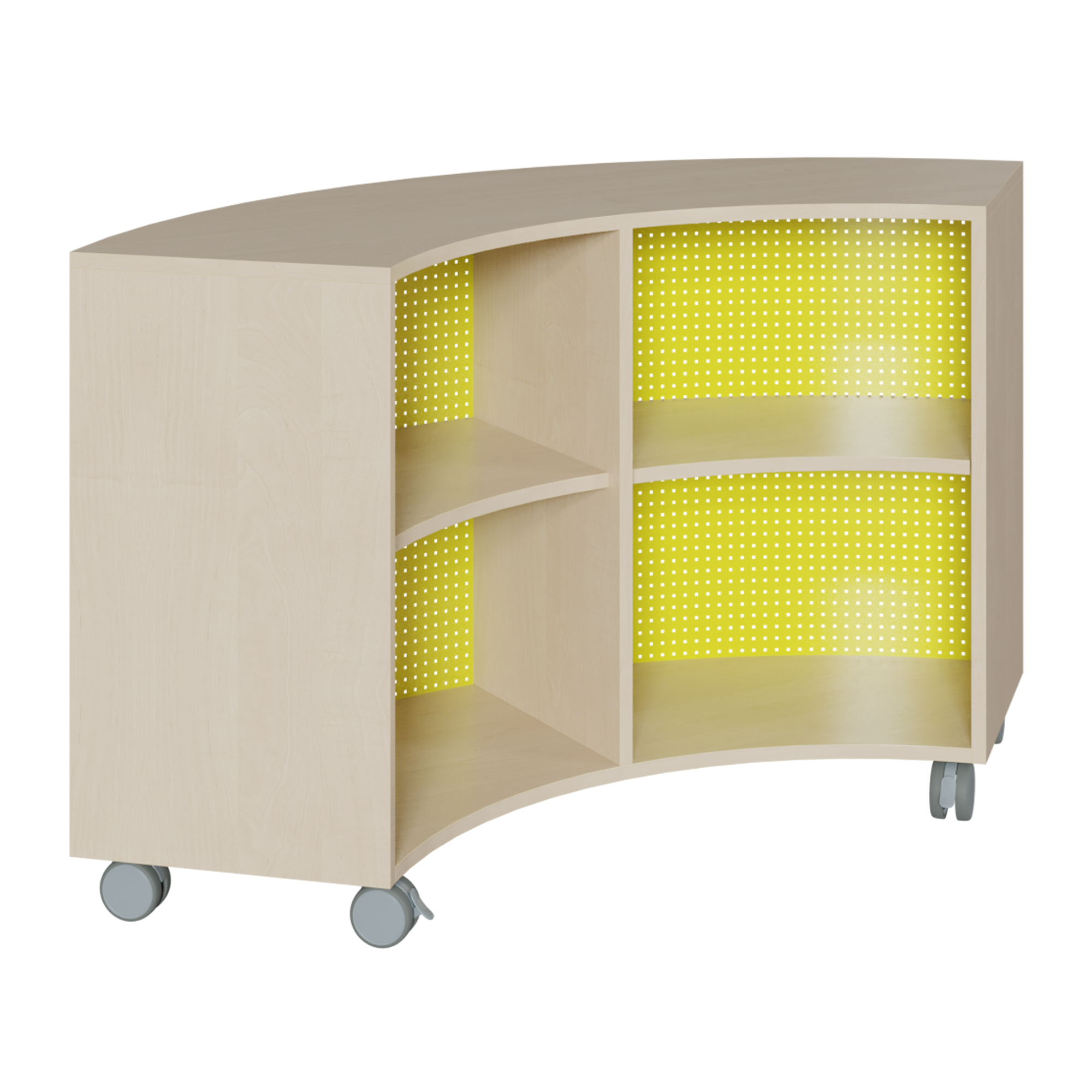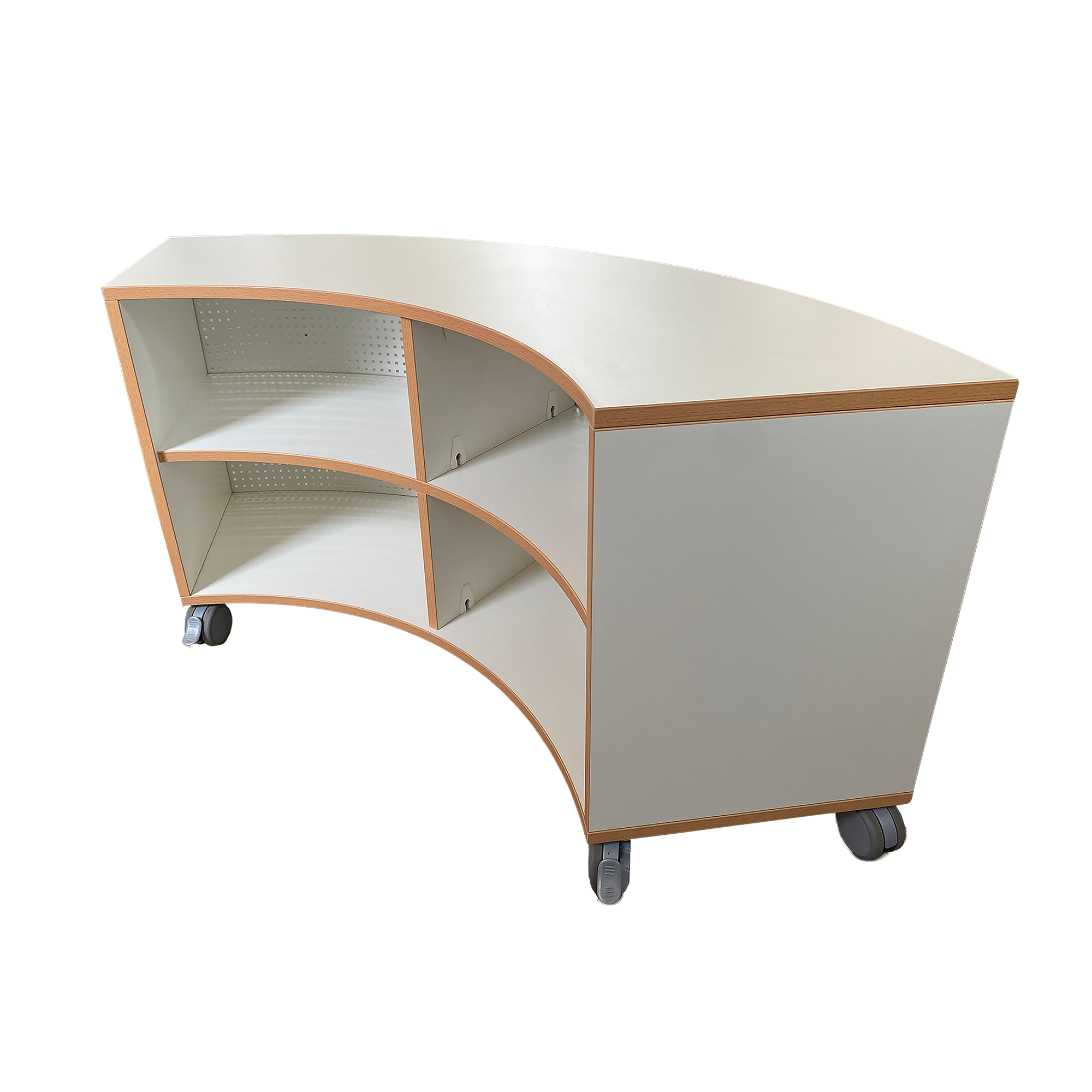 Das fahrbare Bogenregal mit einer Rückwand aus farbige gestaltetem, magnetischem Lochblech wird in 2 verschiedenen Höhen angeboten, es besitzt zur Fachteilung immer eine Mittelwand zur Gliederung und Stabilisierung. Aufgrund der Geometrie rollt es auf 5 Rollen sicher zum jeweiligen Einsatzort, von denen 2 angebremst werden können. Die Anstellbreite des Regals beträgt 40 cm, sie passt damit zu vielen anderen Möbeln. In den jeweiligen Höhen bilden Zwischenböden die Fächer mit konstanter Größe. Der Außendurchmesser beträgt knapp 2 m. DieKorpusteile bestehen aus 19 mm dicker E 1-Feinspanplatte mit einer dekorativen Melaminharzbeschichtung, alle Kanten sind mit 2 mm - ABS-Sicherheitskanten ausgeführt. Das Dekor der Korpusteile kann ausgewählt werden.