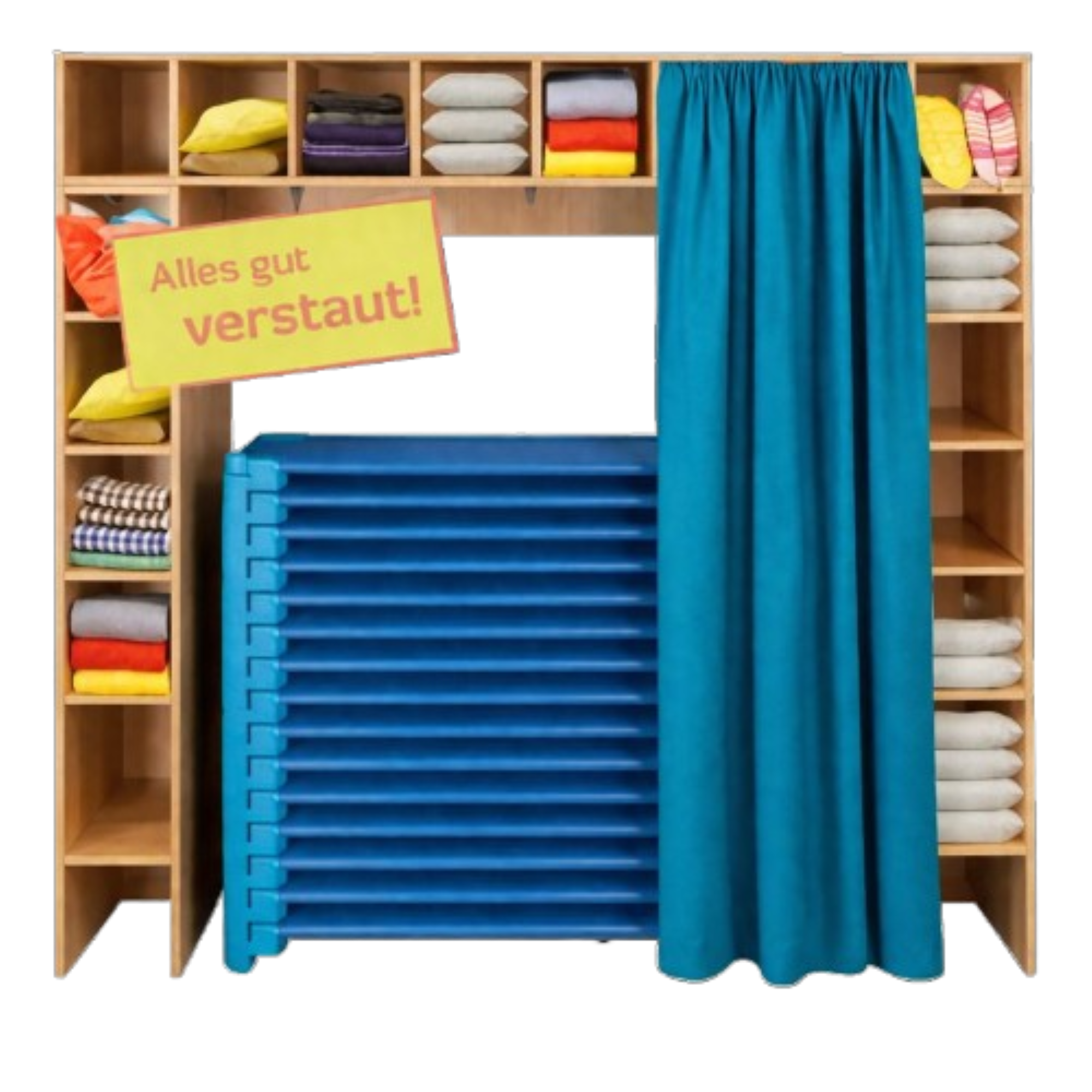 Bis zu 20 Kinderliegen lassen sich in dem Regal unterbringen. Und das Praktische dabei: das Bettzeug lagert gleich in Reichweite. 20 hygienisch getrennte Fächer sind dafür vorgesehen. Das Korpusdekor können Sie nach unserem Dekorangebot wählen. Der Korpus in 60 cm Tiefe wird durch eine um 7 cm nach vorn überstehende Blende mit einer Vorhangeinrichtung erweitert. Der Vorhang verleiht dem Möbel eine ruhige gleichmäßige Frontansicht und zugleich einen schnellen Zugriff auf den gesamten Inhalt.