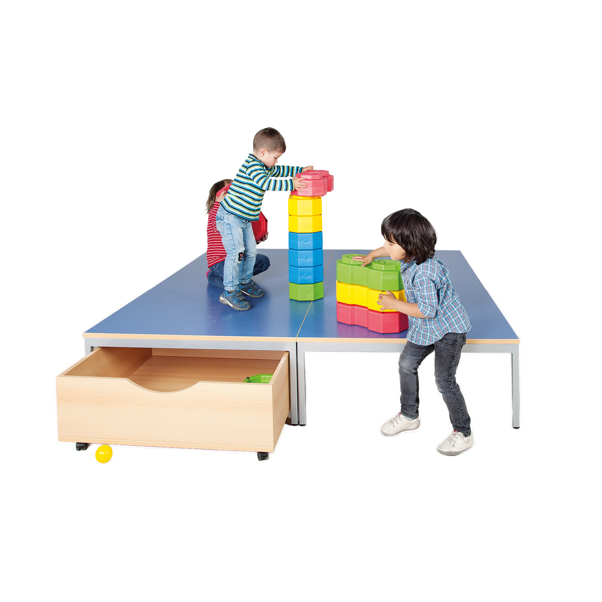 Riesenpodeste auf einem Vierkant-Stahlrohrgestell in 2 verschiedenen Größen mit Linoleumoberplatte bieten Spielfläche und Bühne in einem! Der Raum darunter kann sehr gut als Abstellraum für Rollkästen (z.B. Artikel Nr.: RK 10) genutzt werden.