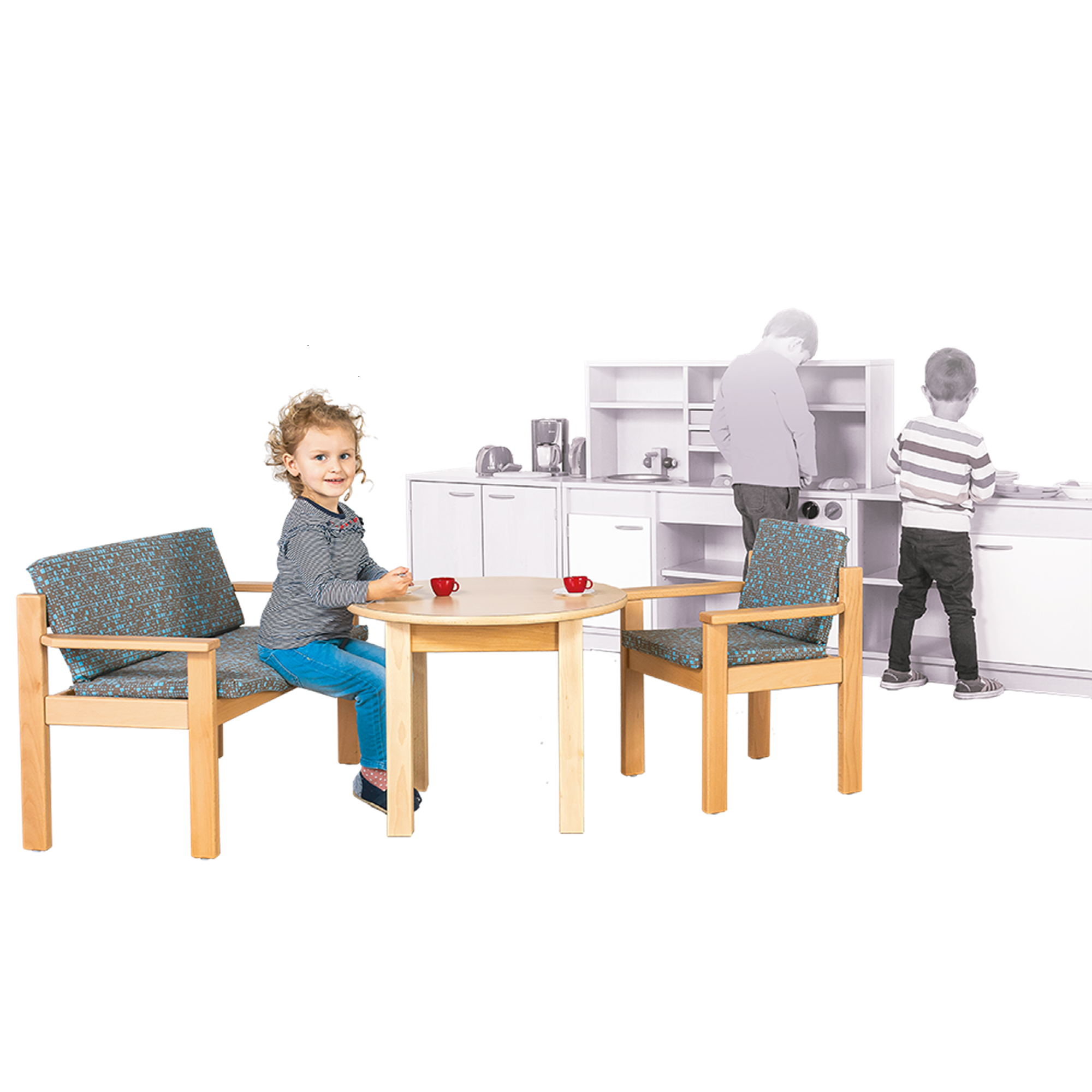 Durch die sehr große Auswahl aus verschiedenen Polsterbezügen in unterschiedlichen Materialien, Farben und Dekoren, kann der Sessel optisch perfekt an jede bunt gestaltete Kita Einrichtung angepasst werden. Und falls beim Puppen-Kaffee-trinken auch mal was daneben kleckert - kein Problem - die Kunstlederbezüge sind feucht abwischbar. Oder die bunt gewebten Stoffe verzeihen auch kleine Gebrauchsspuren im Kita Alltag. Alle Materialien sind phthalatfrei.