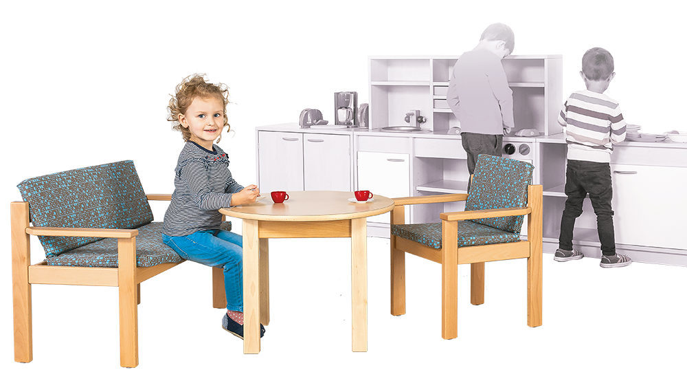 Durch die sehr große Auswahl aus verschiedenen Polsterbezügen in unterschiedlichen Materialien, Farben und Dekoren, kann die Sitzbank optisch perfekt an jede bunt gestaltete Kita Einrichtung angepasst werden. Und falls beim Puppen-Kaffee-trinken auch mal was daneben kleckert - kein Problem - die Kunstlederbezüge sind feucht abwischbar. Oder die bunt gewebten Stoffe verzeihen auch kleine Gebrauchsspuren im Kita Alltag. Alle Materialien sind phthalatfrei. Passend zur Sitzbank empfehlen wir den Sessel mit Polsterauflage 119 130 00.