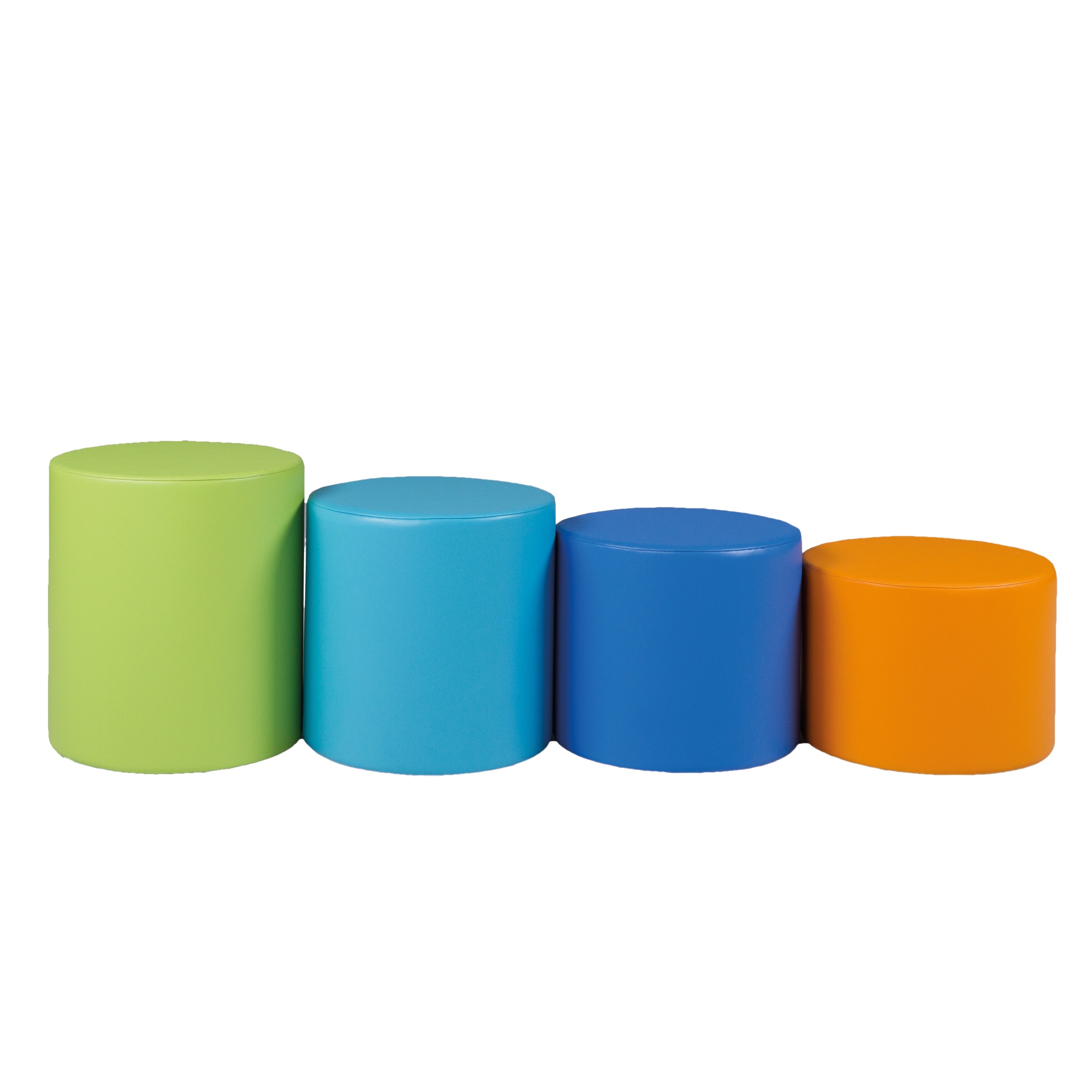 Verschieden große runde Hocker sind geometrisch einfache Zylinder. Mit diesen Elementen lassen sich schöne Sitzkombinationen bilden, die in Durchmesser, Höhe und Farbe variieren. Die strapazierfähige Oberfläche besteht aus Kunstleder und ist damit leicht zu reinigen. Im Inneren befindet sich ein Schaumstoffkern aus hochwertigem Schaumstoff (RG2865), der immer in seine Form zurückkehrt. Die Rund-Hocker besitzen eine Holzbodenplatte, die mit Bodengleitern ausgestattet ist und damit für Stabilität und Schutz bei höherer Beanspruchung sorgt. Dazu kommen andere überzeugende Eigenschaften: stabiles Trägergewebe 100 % PSE, phtalatfreie Beschichtung 100 % PVC, flammenhemmender Bezug nach EN 1021-1+2 mit Flächenmasse von 450 g/m². Aktionsbereiche und auch Ruhebereiche lassen sich damit hervorragend in Größen- und Farbenauswahl gestalten.