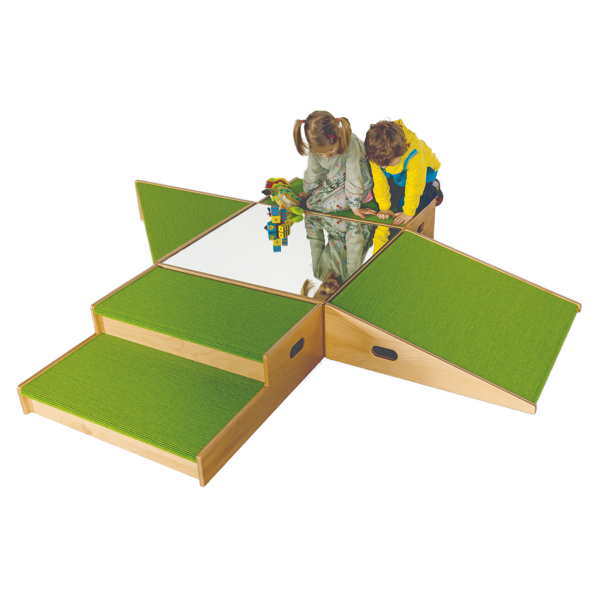 Das Spielpodest-Set "125 019 SET" beinhaltet mehrere unserer stabilen Einzelpodeste als Podestlandschaft. Die Oberflächen besitzen mehrheitlich eine weiche Tretford®-Teppichoberfläche. Natürlich können die Einzelelemente bei Bedarf auch abweichend aufgestellt werden. Die gerundeten Kanten der Multiplexkonstruktion und besonders die großen Kantenradien der sehr stabilen Teppichplatte reduzieren das Verletzungsrisiko auf ein minimale Wahrscheinlichkeit. Durch seitlich angeordnete funktionelle Grifflöcher können die einzelnen Podestelemente mühelos umgebaut, gehoben, verschoben, weggeräumt oder auch gestapelt werden. Das Multiplexmaterial besteht aus heller freundlicher Birke, die wir für einen langen Einsatz mehrfach transparent lackiert haben.