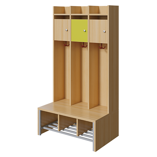 Die getrennte Aufbewahrung der persönlichen Gegenstände ist in allen Ebenen gegeben. In der Spindgarderobe sind alle Wechselsachen des Tages übersichtlich und strukturiert aufgehoben. Die einzelnen Fachmaße B/H/T sind: Ablage 25 x 10 x 23 cm, kleines Fach 25 x 31 x 23 cm mit Tür, Jackenfach 25 x 81 x 23 cm. Das Dekor der Spindgarderobe ist wählbar, ebenso die Farbe der 3fach-Haken oben im Jackenfach. Die Tür besitzt einen Lüftungsschlitz und Griffknopf, die Öffnungsrichtung ist wählbar. Das Schuhwerk wird auf dem mit RAL 9006 - weißaluminium pulverbeschichteten Schuhrost trocken aufbewahrt, Bodenfreiheit 7 cm. Fachmaße B/H/T: 25 x 22 x 53 cm, Sitztiefe 30 cm