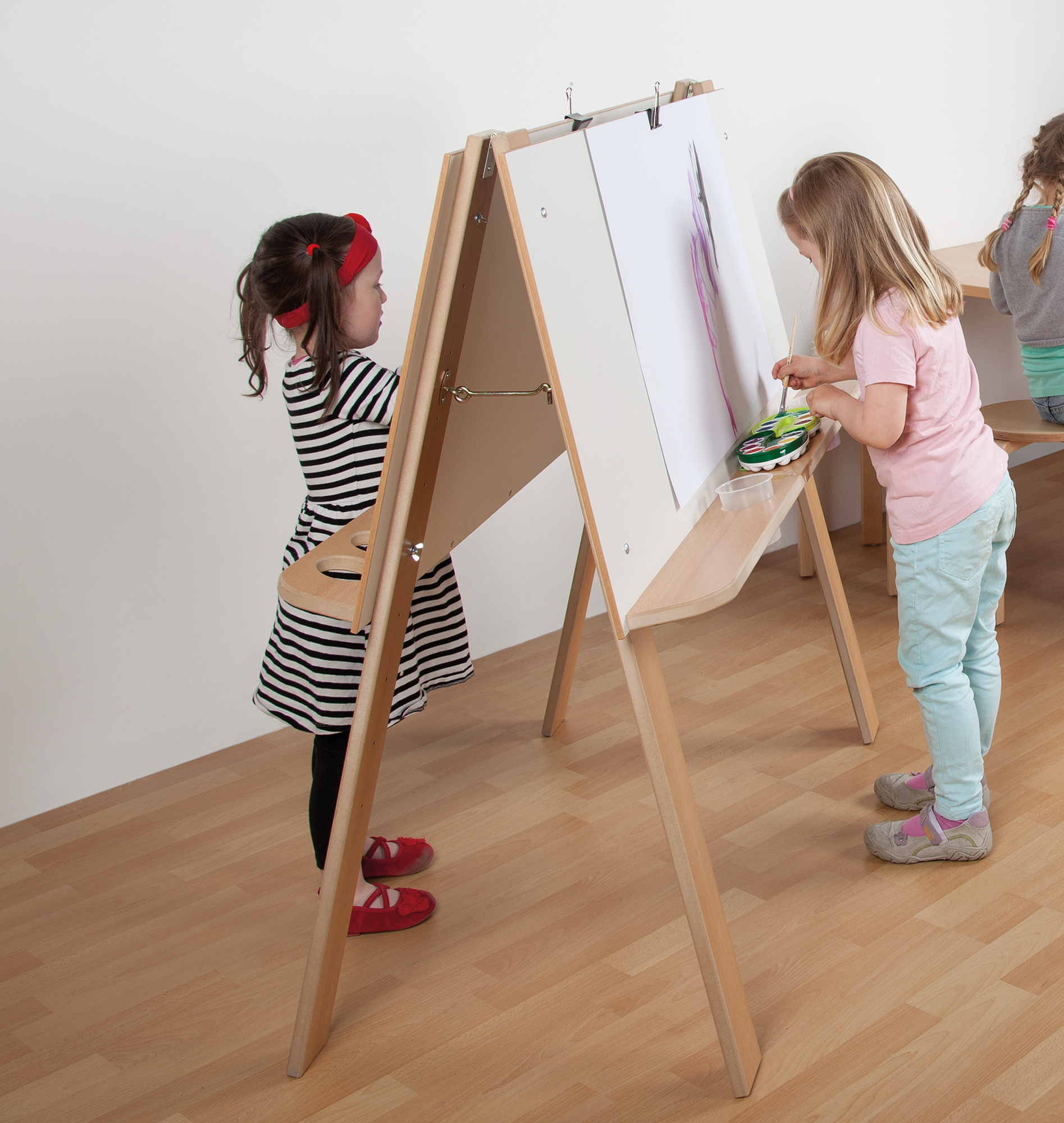 Die beidseitig nutzbare Staffelei besteht als stabiles Gestell aus melaminbeschichtetem MDF-Material. Die Arbeitsflächen beider Seiten sind separat höhenverstellbar und damit auf die Anforderungen der kleinen Künstler jeweils getrennt einstellbar.