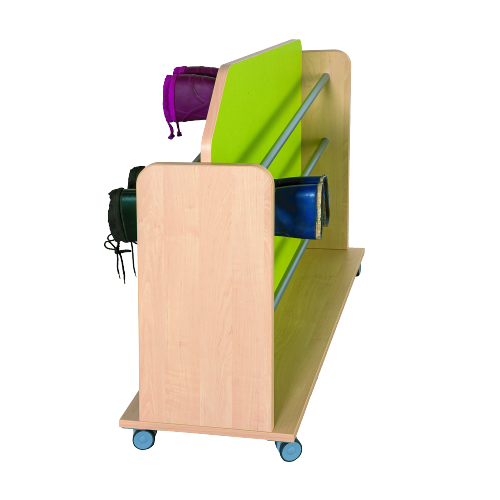 Auf dem doppelseitigen Stiefelwagen wird das Stiefel-Equipment der Kleinen übersichtlich und fahrbar aufbewahrt. Die platzsparende beidseitige Stiefelaufbewahrung in den Maßen B/H/T: 95x88x40 cm bietet hinter je 3 pulverbeschichteten Aluminiumrohren Platz für etwa 25 bis 30 Paar Stiefel. Natürlich kann auch anderes hohes Schuhwerk auf dem Stiefelwagen zum Trocknen aufbewahrt werden. Die formschön gestaltete Rückwand ist beidseitig mit kratz- und wasserfesten Linoleumoberflächen ausgeführt. Der Stiefelwagen ist auf 4 Doppelrollen, davon 2 Stück mit Feststellern, zuverlässig und sicher unterwegs. Das Korpusdekor ist durch die B1-Ausführung mit Buche festgelegt, die Linoleumfarbe ist jedoch wählbar!