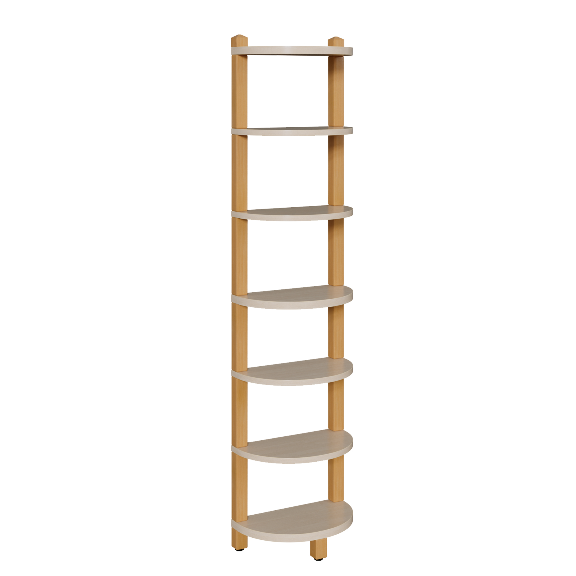 Das Stollenabschlußregal besteht wie alle anderen Stollenmöbel aus Massivholzstollen mit einem Querschnitt 4x4 cm und dazwischen montierten halbrunden Böden aus 19 bzw. 25 mm dicker E 1-Feinspanplatte mit Melaminharzbeschichtung und 2 mm dicken ABS-Sicherheitskanten. Das Regal wird immer an andere Möbeln montiert oder wandmontiert geplant. Durch dieses Regal werden die eckigen Enden von raumseitig stehenden Möbeln an der Stirnseite sehr elegant in einen sicherheitsbewußten Radius überführt.