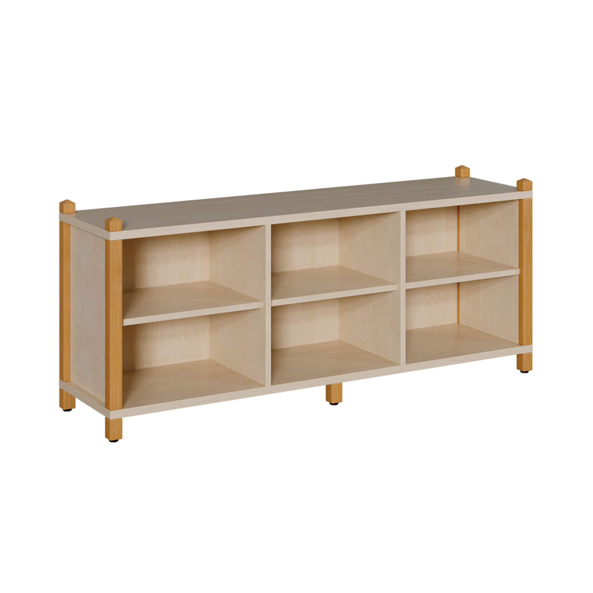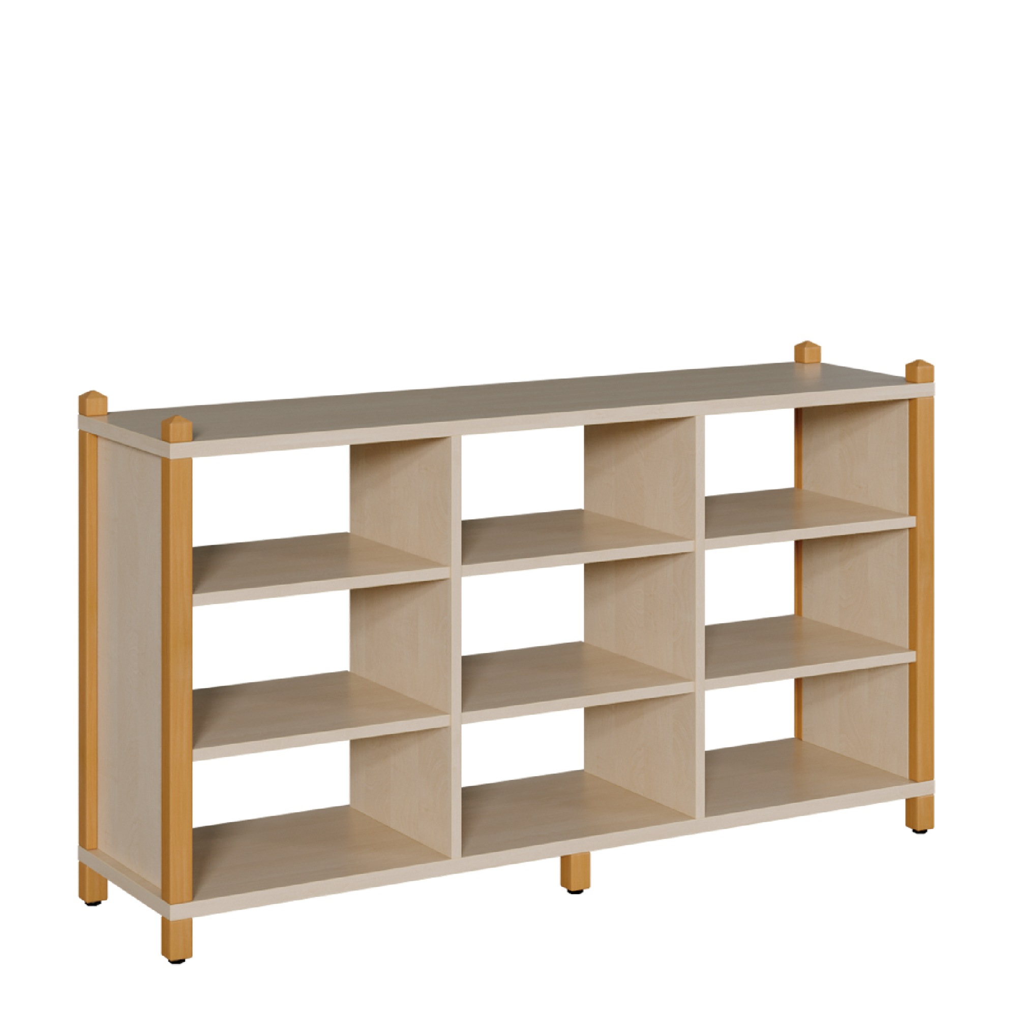 Das Raumteilerregal ist ein 3reihiges Regal in stabiler Stollenbauweise mit 2 Mittelwänden in 2 verschiedenen Höhen und stellt in 6 bzw. 9 Fächern Stauraum zur Verfügung. Aufgrund der großen Breite besitzt das Regal mittig einen zusätzlichen 5. Stützfuß. Die beiden Varianten bieten eine Ausführung mit einseitiger Rückwand und eine weitere mit beidseitigem Regalzugang an. Die Korpusteile bestehen aus 19 bzw. 25 mm dicker E 1-Feinspanplatte mit einer dekorativen Melaminharzbeschichtung, alle Kanten sind mit 2 mm - ABS-Sicherheitskanten ausgeführt. Das Korpusdekor ist ebenso wählbar wie die Stollenfarbe.