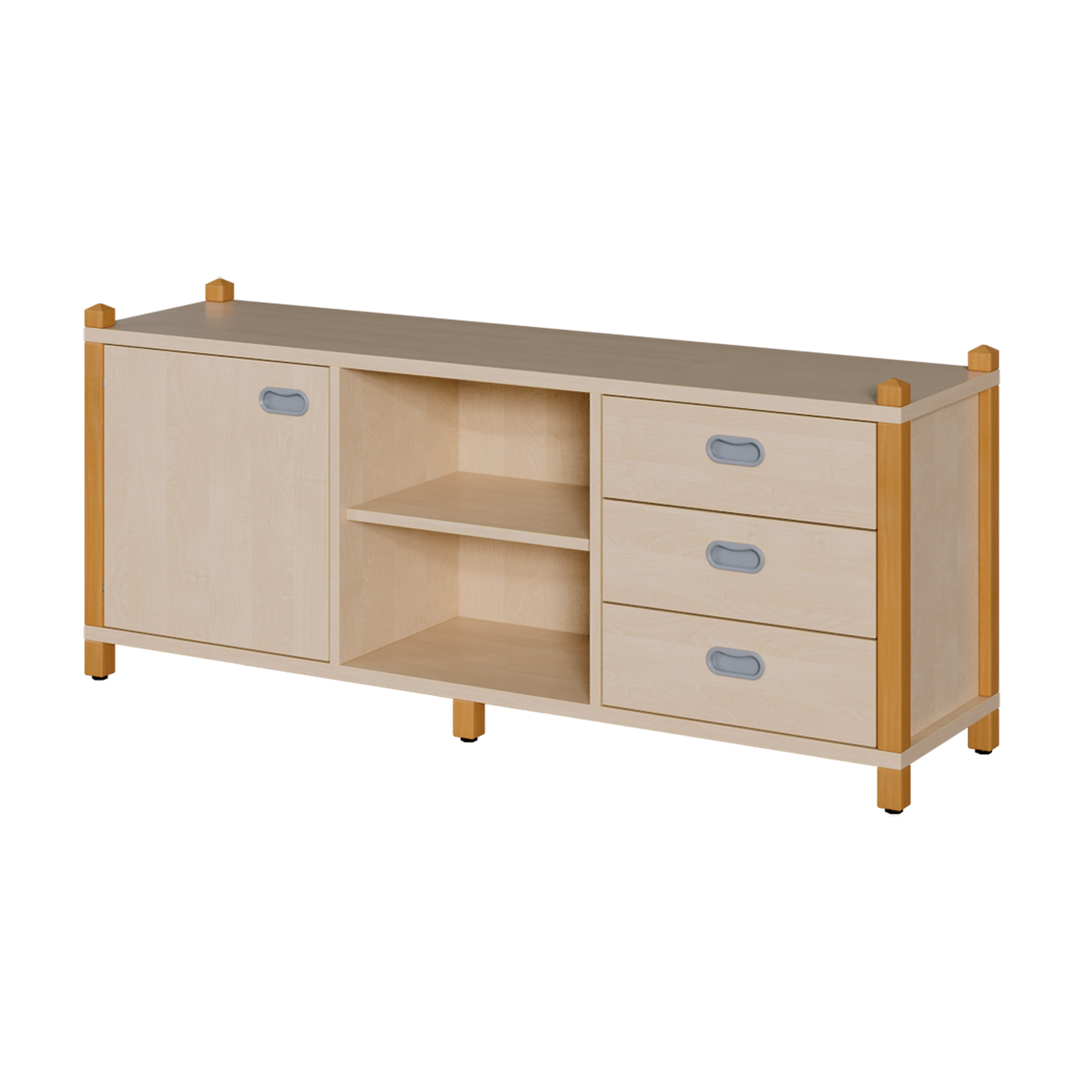 Der Raumteilerschrank ist eine 3reihige Konstruktion in stabiler Stollenbauweise mit 2 Mittelwänden. Bis zu 3 verschiedene Ausstattungsmerkmale können miteinander kombiniert werden: Tür, Regal und/oder 3 übereinanderliegende Schübe. In jedem Fall ist es viel Stauraum, der hier zur Verfügung gestellt wird. Aufgrund der großen Breite besitzt der Schrank mittig einen zusätzlichen 5. Stützfuß. Die Korpusteile bestehen aus 19 bzw. 25 mm dicker E 1-Feinspanplatte mit einer dekorativen Melaminharzbeschichtung, alle Kanten sind mit 2 mm - ABS-Sicherheitskanten ausgeführt. Das Korpusdekor ist ebenso wählbar wie die Stollenfarbe. Zusätzlich kann die Front in einem weiteren Dekor ausgeführt werden.