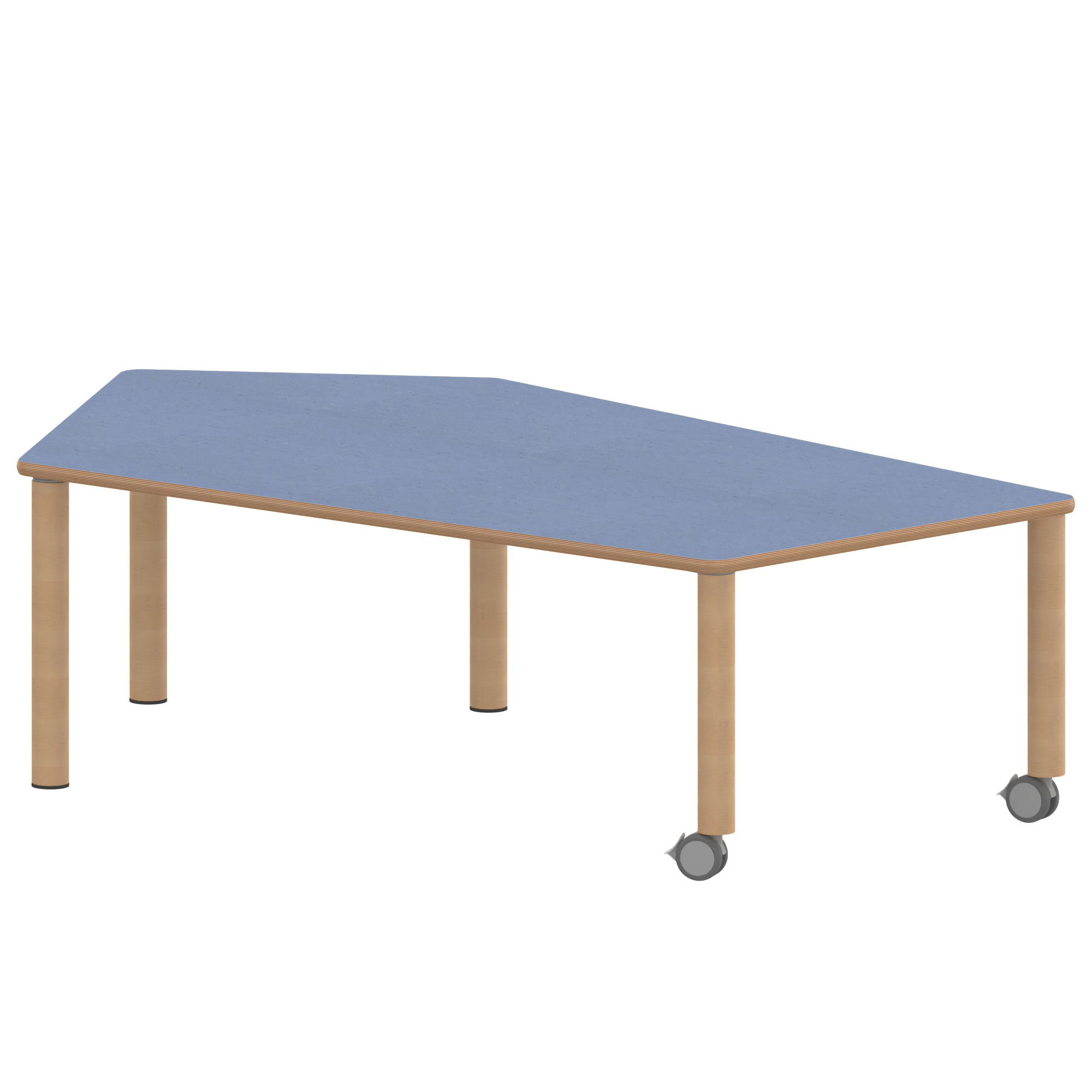 Fünfecktisch-groß, Stellfläche B/T: 185x104 cm, Höhen 25…76 cm, Massivholzbeine Ø 60 mm, Fußvariante: fahrbar