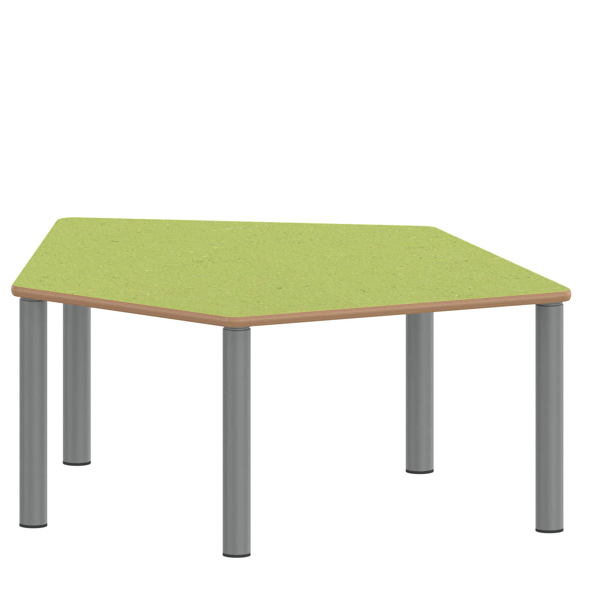 Fünfecktisch-klein, Stellfläche B/T: 121x110 cm, Höhen 25…76 cm, Stahlrohrbeine Ø 60 mm, Fußvariante: Stellfuß