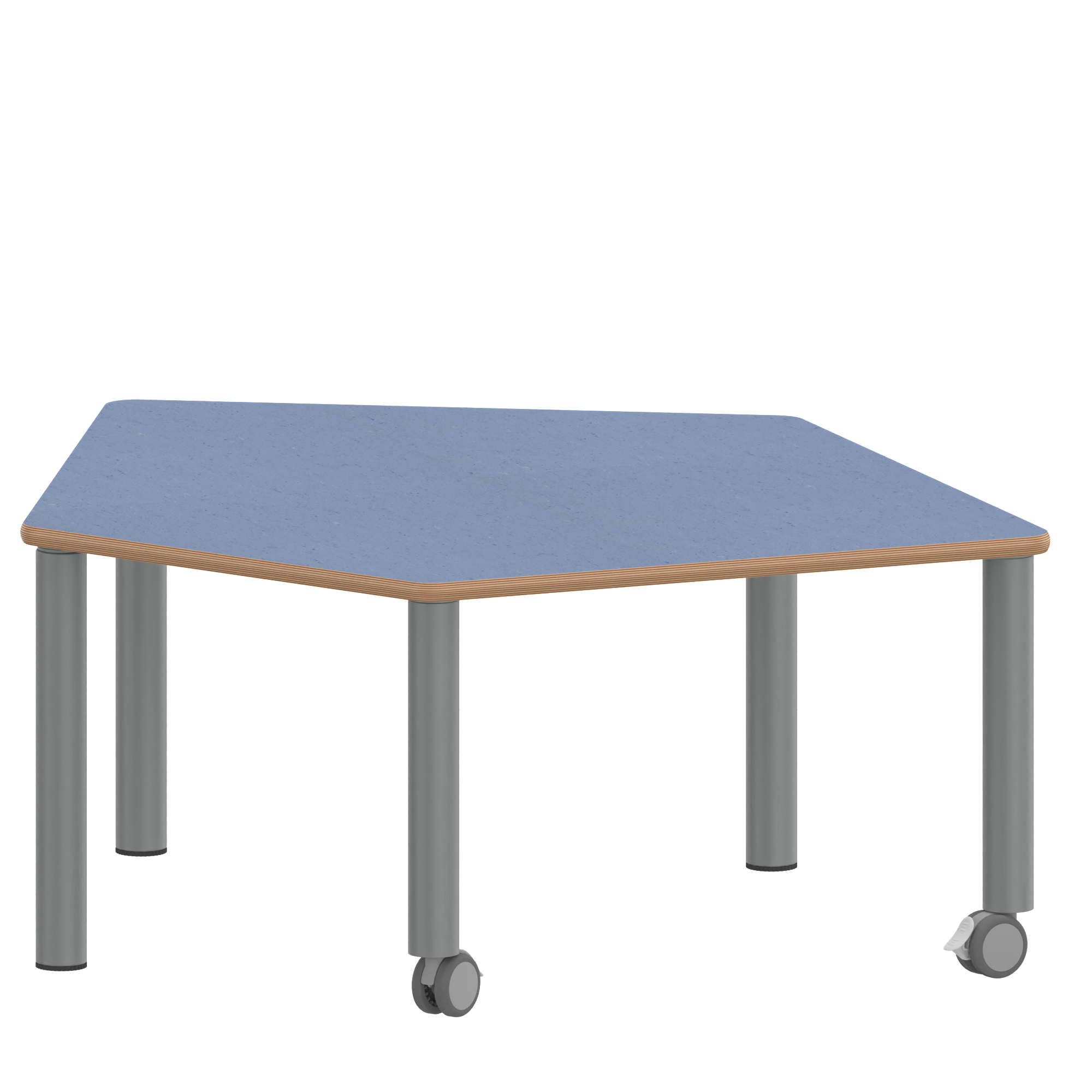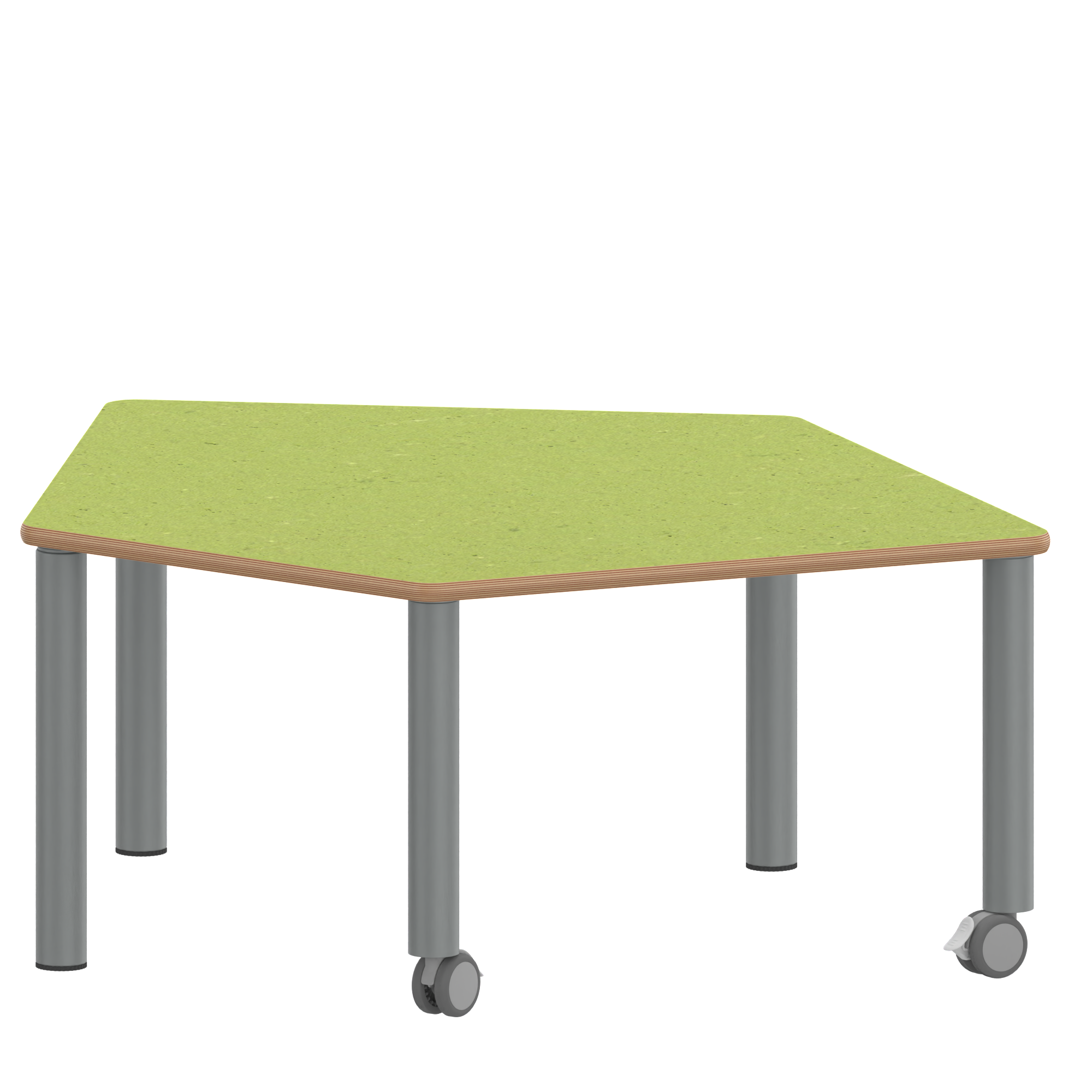 Fünfecktisch-klein, Stellfläche B/T: 121x110 cm, Höhen 25…76 cm, Stahlrohrbeine Ø 60 mm, Fußvariante: fahrbar