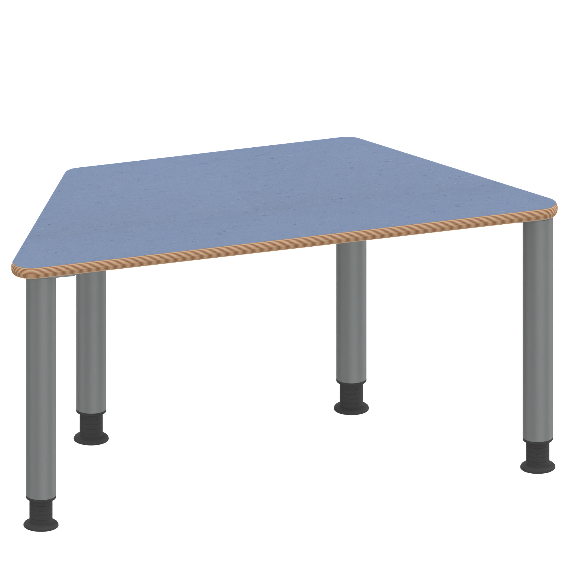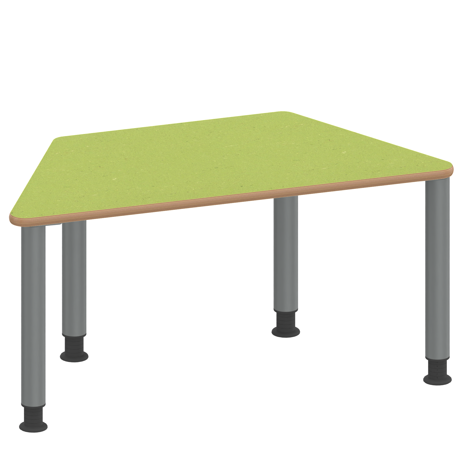Trapez-Tische, Maße B/T: 140x70 bzw. 120x60 cm, Höhen 41…76 cm, Stahlrohrbeine Ø 60 mm, Fußvariante: höhenverstellbar