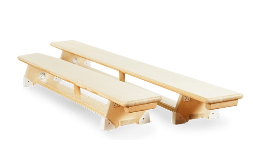 Die Sitzflächen der Turnbank bestehen aus Nadelholz, die Füße aus Hartholz.