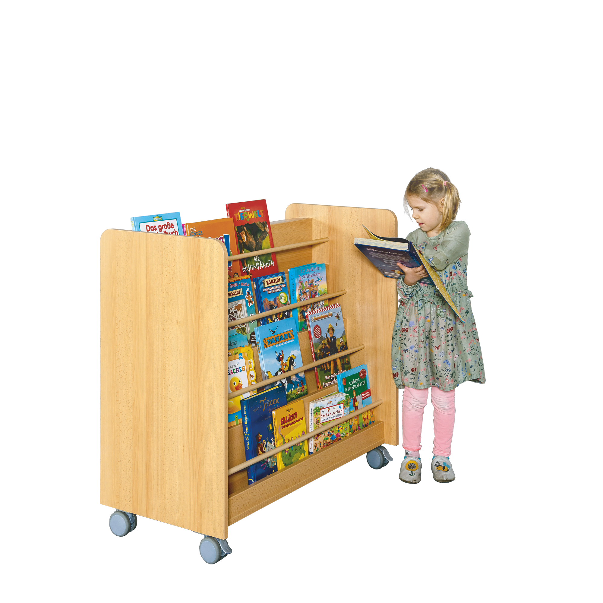 Diese mobile, beidseitig nutzbare Wendebibliothek auf vier Rollen, davon zwei feststellbar, bietet Platz für jede Menge Bücher.