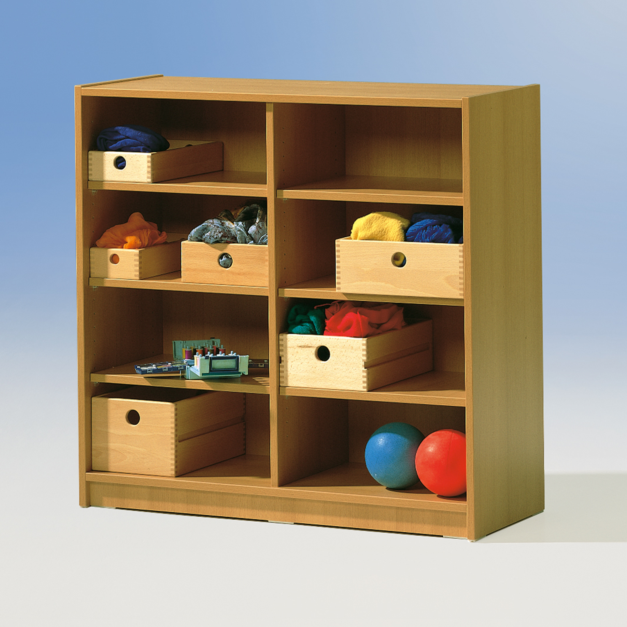 In Verbindung mit den frei einzustellenden Holzkästen der Modellreihe HK 1 bis HK 8 ist dieses Regal ideal zur Aufbewahrung geeignet. Durch 6 Einlegeboden lässt sich die Höhe der 8 Fächer im Raster von 32 mm beliebig variieren. Die Einlegeböden unserer Schränke sind mit einer Auszugsicherung versehen, die das ungewollte Herausziehen verhindert.