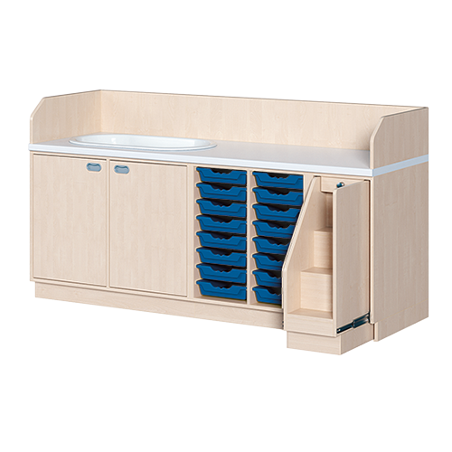 Ob als einzeln aufgestellter Wickelschrank oder als große Wickelkombination - in jedem Fall bieten die verschiedenen Elemente der Wickelkommoden langlebige Materialien, geprüfte Sicherheit, ergonomische Maße und zudem viel Stauraum. Dreiseitige Sicherheits-Aufkantungen umranden die Arbeitsplatte, die vorn benutzerfreundlich gerundet ist und über eine beschichtete und damit wasserabweisende Oberfläche mit zusätzlichen antibakteriellen Eigenschaften verfügt. Eingelassene Griffe und der zurückgesetzte Sockel gestatten ein nahes Herantreten an den Wickelplatz. Als Ausstattungen sind verschiedene Varianten rückenschonender Aufstiegshilfen, Schübe, sowie Kinderbadewannen und Handwaschbecken erhältlich. Optional ist eine besonders wasserfeste Sockelvariante lieferbar. Es kann zwischen zwei verschiedenen Arbeitstiefen und Rechts/Links-Varianten der Schränke gewählt werden. Die Belastbarkeit beträgt bis zu 75 kg. Die Wickelauflage ist separat zu bestellen (Art.Nr. "WIC P..." in der jeweiligen Breite und Tiefe). Ebenso ist bei der Bestellung die gewünschte Ausführung der Einhebel-Mischbatterie - schwenkbare oder herausnehmbare Ausführung - (Art.Nr. "KG 02...") zusätzlich zu vermerken.