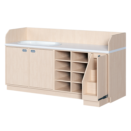 Ob als einzeln aufgestellter Wickelschrank oder als große Wickelkombination - in jedem Fall bieten die verschiedenen Elemente der Wickelkommoden langlebige Materialien, geprüfte Sicherheit, ergonomische Maße und zudem viel Stauraum. Dreiseitige Sicherheits-Aufkantungen umranden die Arbeitsplatte, die vorn benutzerfreundlich gerundet ist und über eine beschichtete und damit wasserabweisende Oberfläche mit zusätzlichen antibakteriellen Eigenschaften verfügt. Eingelassene Griffe und der zurückgesetzte Sockel gestatten ein nahes Herantreten an den Wickelplatz. Als Ausstattungen sind verschiedene Varianten rückenschonender Aufstiegshilfen, Schübe, sowie Kinderbadewannen und Handwaschbecken erhältlich. Optional ist eine besonders wasserfeste Sockelvariante lieferbar. Es kann zwischen zwei verschiedenen Arbeitstiefen und Rechts/Links-Varianten der Schränke gewählt werden. Die Belastbarkeit beträgt bis zu 75 kg. Die Wickelauflage ist separat zu bestellen (Art.Nr. "WIC P..." in der jeweiligen Breite und Tiefe). Ebenso ist bei der Bestellung die gewünschte Ausführung der Einhebel-Mischbatterie - schwenkbare oder herausnehmbare Ausführung - (Art.Nr. "KG 02...") zusätzlich zu vermerken.