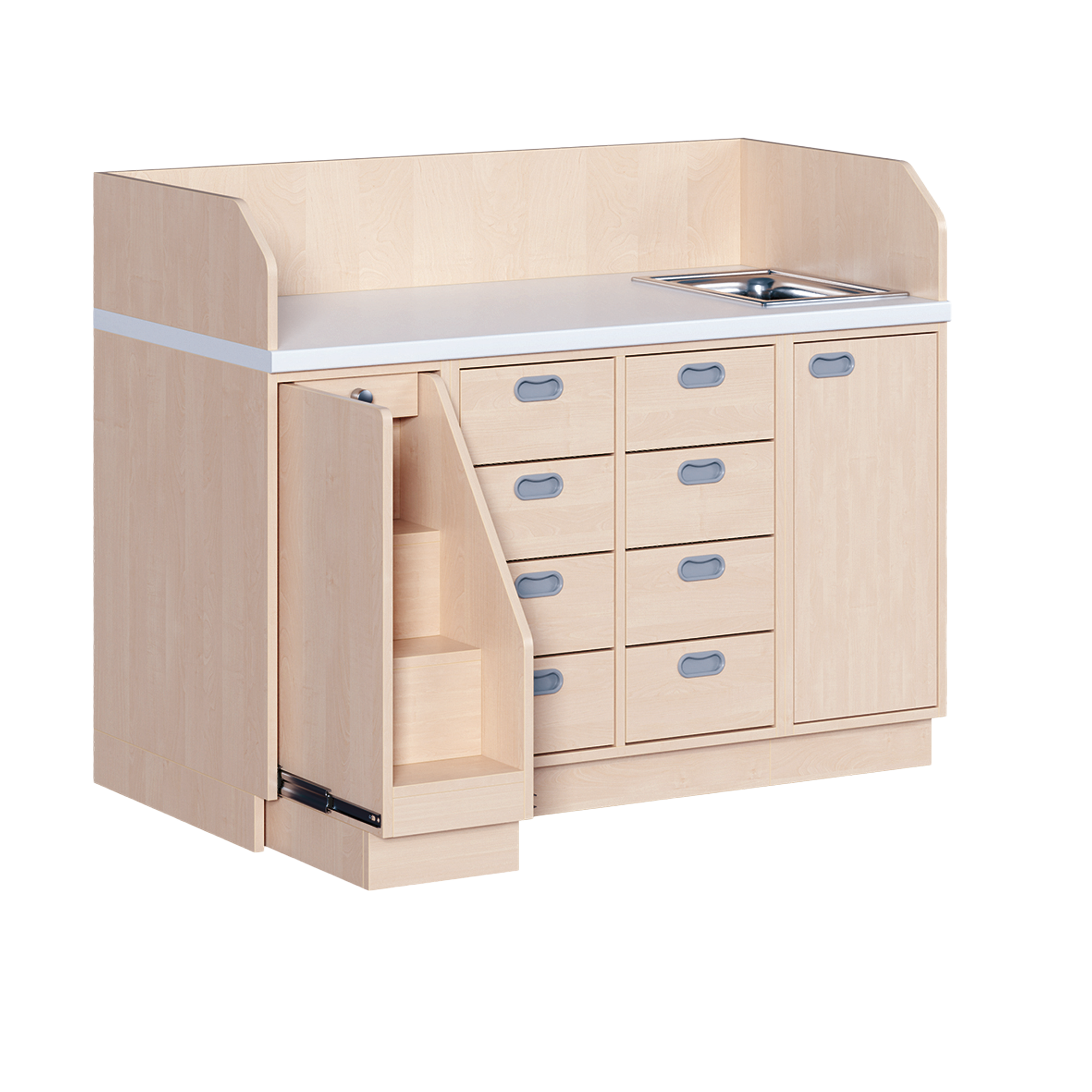 Ob als einzeln aufgestellter Wickelschrank oder als große Wickelkombination - in jedem Fall bieten die verschiedenen Elemente der Wickelkommoden langlebige Materialien, geprüfte Sicherheit, ergonomische Maße und zudem viel Stauraum. Dreiseitige Sicherheits-Aufkantungen umranden die Arbeitsplatte, die vorn benutzerfreundlich gerundet ist und über eine beschichtete und damit wasserabweisende Oberfläche mit zusätzlichen antibakteriellen Eigenschaften verfügt. Eingelassene Griffe und der zurückgesetzte Sockel gestatten ein nahes Herantreten an den Wickelplatz. Als Ausstattungen sind verschiedene Varianten rückenschonender Aufstiegshilfen, Schübe, sowie Kinderbadewannen und Handwaschbecken erhältlich. Optional ist eine besonders wasserfeste Sockelvariante lieferbar. Es kann zwischen zwei verschiedenen Arbeitstiefen und Rechts/Links-Varianten der Schränke gewählt werden. Die Belastbarkeit beträgt bis zu 75 kg. Die Wickelauflage ist separat zu bestellen (Art.Nr. "WIC P..." in der jeweiligen Breite und Tiefe). Ebenso ist bei der Bestellung die gewünschte Ausführung der Einhebel-Mischbatterie - schwenkbare oder herausnehmbare Ausführung - (Art.Nr. "KG 02...") zusätzlich zu vermerken.