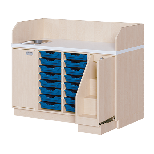 Ob als einzeln aufgestellter Wickelschrank oder als große Wickelkombination - in jedem Fall bieten die verschiedenen Elemente der Wickelkommoden langlebige Materialien, geprüfte Sicherheit, ergonomische Maße und zudem viel Stauraum. Dreiseitige Sicherheits-Aufkantungen umranden die Arbeitsplatte, die vorn benutzerfreundlich gerundet ist und über eine beschichtete und damit wasserabweisende Oberfläche mit zusätzlichen antibakteriellen Eigenschaften verfügt. Eingelassene Griffe und der zurückgesetzte Sockel gestatten ein nahes Herantreten an den Wickelplatz. Als Ausstattungen sind verschiedene Varianten rückenschonender Aufstiegshilfen, Schübe, sowie Kinderbadewannen und Handwaschbecken erhältlich. Optional ist eine besonders wasserfeste Sockelvariante lieferbar. Es kann zwischen zwei verschiedenen Arbeitstiefen und Rechts/Links-Varianten der Schränke gewählt werden. Die Belastbarkeit beträgt bis zu 75 kg. Die Wickelauflage ist separat zu bestellen (Art.Nr. "WIC P..." in der jeweiligen Breite und Tiefe). Ebenso ist bei der Bestellung die gewünschte Ausführung der Einhebel-Mischbatterie - schwenkbare oder herausnehmbare Ausführung - (Art.Nr. "KG 02...") zusätzlich zu vermerken.