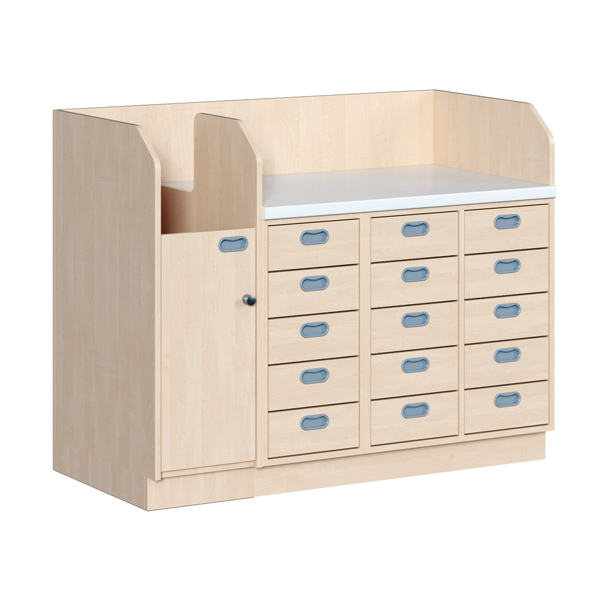 Ob als einzeln aufgestellter Wickelschrank oder als große Wickelkombination - in jedem Fall bieten die verschiedenen Elemente der Wickelkommoden langlebige Materialien, geprüfte Sicherheit, ergonomische Maße und zudem viel Stauraum. Dreiseitige Sicherheits-Aufkantungen umranden die Arbeitsplatte, die vorn benutzerfreundlich gerundet ist und über eine beschichtete und damit wasserabweisende Oberfläche mit zusätzlichen antibakteriellen Eigenschaften verfügt. Eingelassene Griffe und der zurückgesetzte Sockel gestatten ein nahes Herantreten an den Wickelplatz. Als Ausstattungen sind verschiedene Varianten rückenschonender Aufstiegshilfen, Schübe, sowie Kinderbadewannen und Handwaschbecken erhältlich. Optional ist eine besonders wasserfeste Sockelvariante lieferbar. Es kann zwischen zwei verschiedenen Arbeitstiefen und Rechts/Links-Varianten der Schränke gewählt werden. Die Belastbarkeit beträgt bis zu 75 kg. Die Wickelauflage ist separat zu bestellen (Art.Nr. "WIC P..." in der jeweiligen Breite und Tiefe).