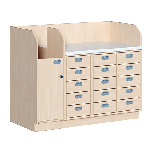Ob als einzeln aufgestellter Wickelschrank oder als große Wickelkombination - in jedem Fall bieten die verschiedenen Elemente der Wickelkommoden langlebige Materialien, geprüfte Sicherheit, ergonomische Maße und zudem viel Stauraum. Dreiseitige Sicherheits-Aufkantungen umranden die Arbeitsplatte, die vorn benutzerfreundlich gerundet ist und über eine beschichtete und damit wasserabweisende Oberfläche mit zusätzlichen antibakteriellen Eigenschaften verfügt. Eingelassene Griffe und der zurückgesetzte Sockel gestatten ein nahes Herantreten an den Wickelplatz. Als Ausstattungen sind verschiedene Varianten rückenschonender Aufstiegshilfen, Schübe, sowie Kinderbadewannen und Handwaschbecken erhältlich. Optional ist eine besonders wasserfeste Sockelvariante lieferbar. Es kann zwischen zwei verschiedenen Arbeitstiefen und Rechts/Links-Varianten der Schränke gewählt werden. Die Belastbarkeit beträgt bis zu 75 kg. Die Wickelauflage ist separat zu bestellen (Art.Nr. "WIC P..." in der jeweiligen Breite und Tiefe).