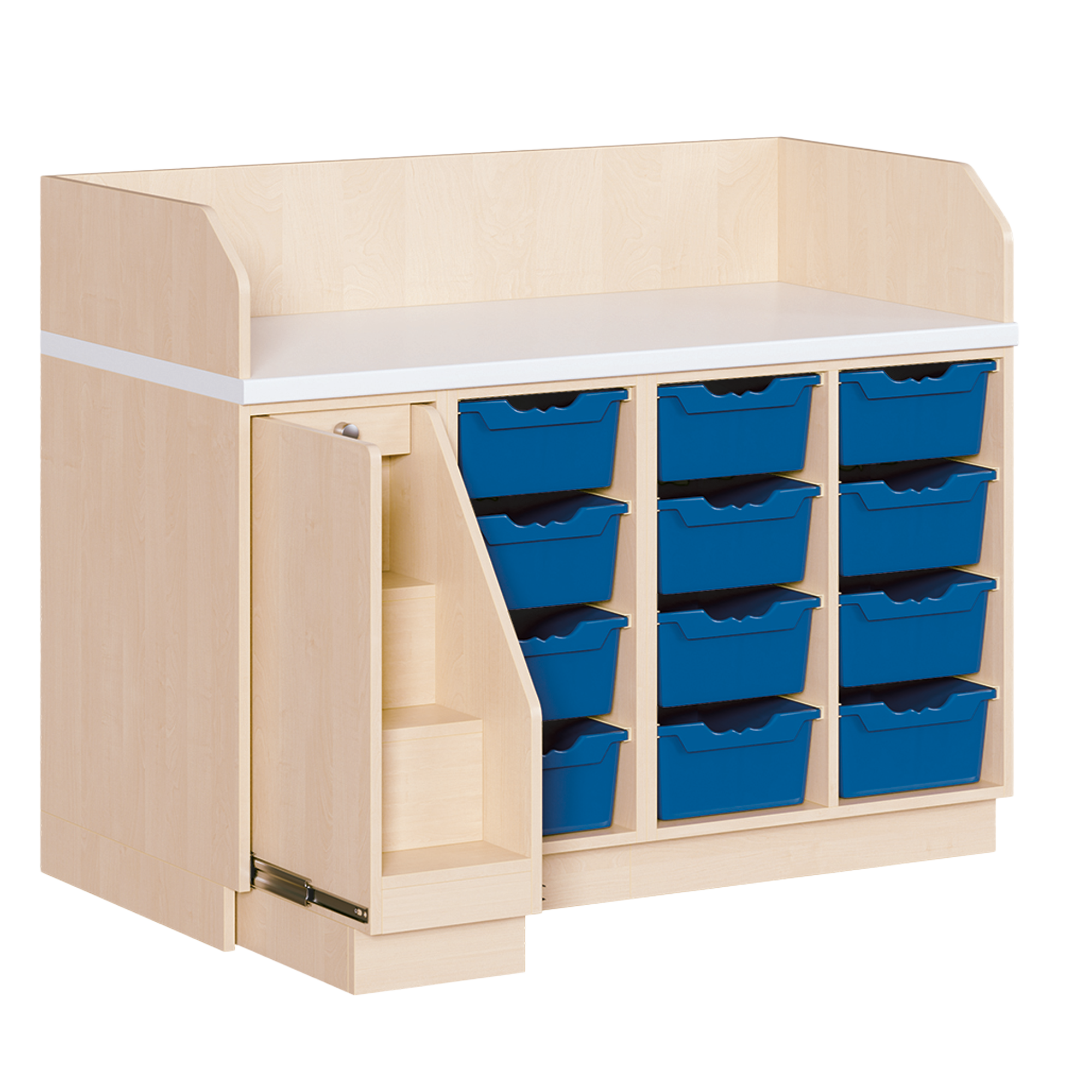 Ob als einzeln aufgestellter Wickelschrank oder als große Wickelkombination - in jedem Fall bieten die verschiedenen Elemente der Wickelkommoden langlebige Materialien, geprüfte Sicherheit, ergonomische Maße und zudem viel Stauraum. Dreiseitige Sicherheits-Aufkantungen umranden die Arbeitsplatte, die vorn benutzerfreundlich gerundet ist und über eine beschichtete und damit wasserabweisende Oberfläche mit zusätzlichen antibakteriellen Eigenschaften verfügt. Eingelassene Griffe und der zurückgesetzte Sockel gestatten ein nahes Herantreten an den Wickelplatz. Als Ausstattungen sind verschiedene Varianten rückenschonender Aufstiegshilfen, Schübe, sowie Kinderbadewannen und Handwaschbecken erhältlich. Optional ist eine besonders wasserfeste Sockelvariante lieferbar. Es kann zwischen zwei verschiedenen Arbeitstiefen und Rechts/Links-Varianten der Schränke gewählt werden. Die Belastbarkeit beträgt bis zu 75 kg. Die Wickelauflage ist separat zu bestellen (Art.Nr. "WIC P..." in der jeweiligen Breite und Tiefe).