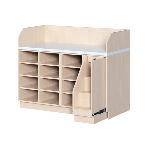 Ob als einzeln aufgestellter Wickelschrank oder als große Wickelkombination - in jedem Fall bieten die verschiedenen Elemente der Wickelkommoden langlebige Materialien, geprüfte Sicherheit, ergonomische Maße und zudem viel Stauraum. Dreiseitige Sicherheits-Aufkantungen umranden die Arbeitsplatte, die vorn benutzerfreundlich gerundet ist und über eine beschichtete und damit wasserabweisende Oberfläche mit zusätzlichen antibakteriellen Eigenschaften verfügt. Eingelassene Griffe und der zurückgesetzte Sockel gestatten ein nahes Herantreten an den Wickelplatz. Als Ausstattungen sind verschiedene Varianten rückenschonender Aufstiegshilfen, Schübe, sowie Kinderbadewannen und Handwaschbecken erhältlich. Optional ist eine besonders wasserfeste Sockelvariante lieferbar. Es kann zwischen zwei verschiedenen Arbeitstiefen und Rechts/Links-Varianten der Schränke gewählt werden. Die Belastbarkeit beträgt bis zu 75 kg. Die Wickelauflage ist separat zu bestellen (Art.Nr. "WIC P..." in der jeweiligen Breite und Tiefe).