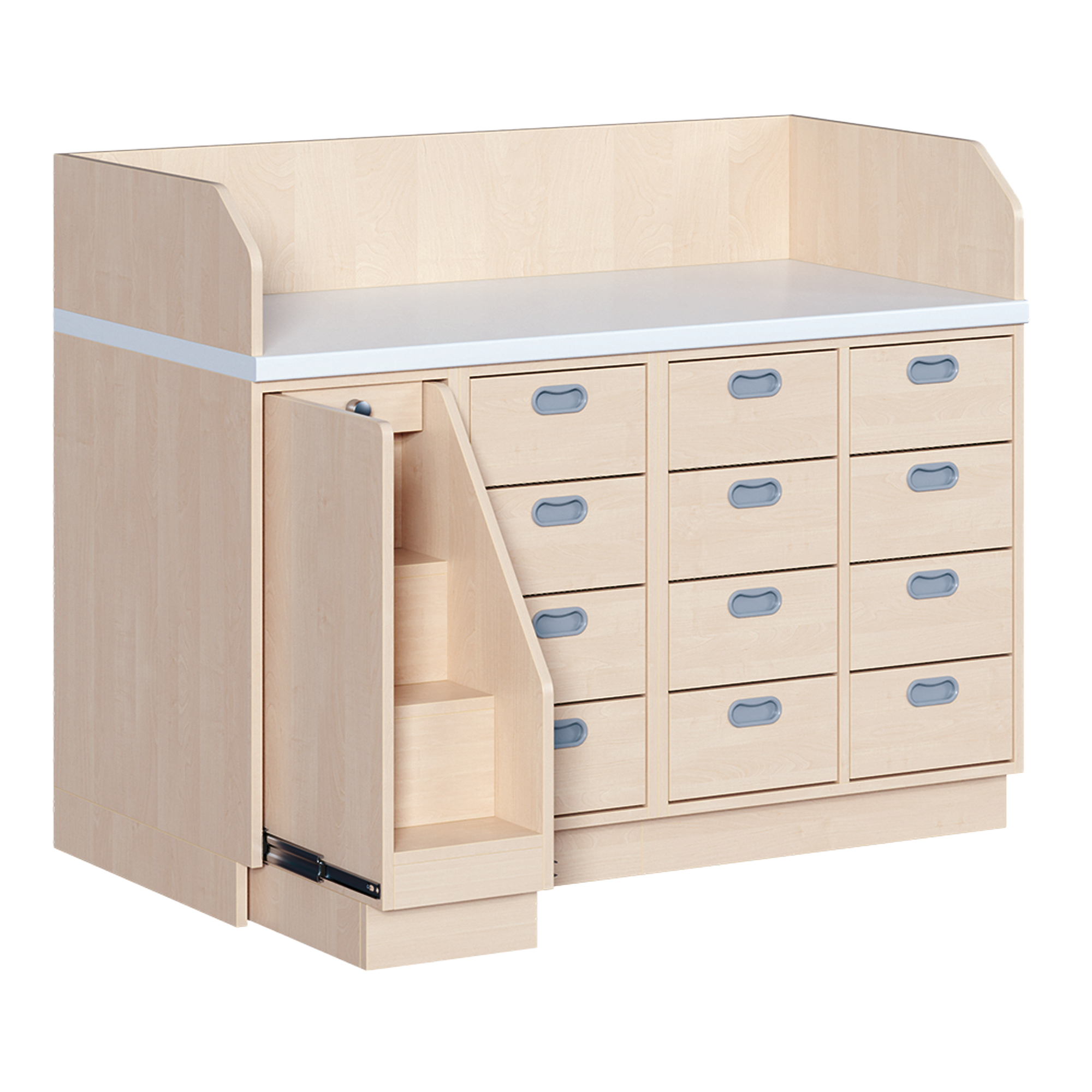 Ob als einzeln aufgestellter Wickelschrank oder als große Wickelkombination - in jedem Fall bieten die verschiedenen Elemente der Wickelkommoden langlebige Materialien, geprüfte Sicherheit, ergonomische Maße und zudem viel Stauraum. Dreiseitige Sicherheits-Aufkantungen umranden die Arbeitsplatte, die vorn benutzerfreundlich gerundet ist und über eine beschichtete und damit wasserabweisende Oberfläche mit zusätzlichen antibakteriellen Eigenschaften verfügt. Eingelassene Griffe und der zurückgesetzte Sockel gestatten ein nahes Herantreten an den Wickelplatz. Als Ausstattungen sind verschiedene Varianten rückenschonender Aufstiegshilfen, Schübe, sowie Kinderbadewannen und Handwaschbecken erhältlich. Optional ist eine besonders wasserfeste Sockelvariante lieferbar. Es kann zwischen zwei verschiedenen Arbeitstiefen und Rechts/Links-Varianten der Schränke gewählt werden. Die Belastbarkeit beträgt bis zu 75 kg. Die Wickelauflage ist separat zu bestellen (Art.Nr. "WIC P..." in der jeweiligen Breite und Tiefe).