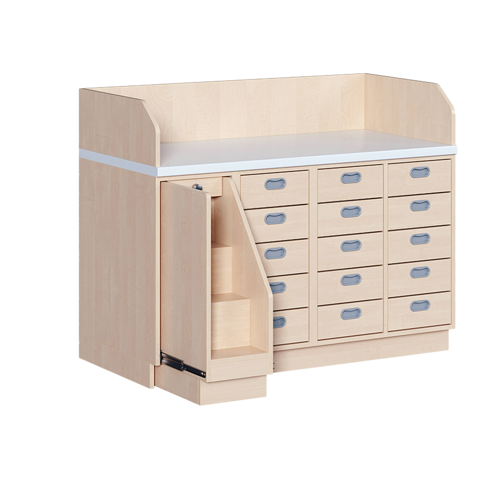Ob als einzeln aufgestellter Wickelschrank oder als große Wickelkombination - in jedem Fall bieten die verschiedenen Elemente der Wickelkommoden langlebige Materialien, geprüfte Sicherheit, ergonomische Maße und zudem viel Stauraum. Dreiseitige Sicherheits-Aufkantungen umranden die Arbeitsplatte, die vorn benutzerfreundlich gerundet ist und über eine beschichtete und damit wasserabweisende Oberfläche mit zusätzlichen antibakteriellen Eigenschaften verfügt. Eingelassene Griffe und der zurückgesetzte Sockel gestatten ein nahes Herantreten an den Wickelplatz. Als Ausstattungen sind verschiedene Varianten rückenschonender Aufstiegshilfen, Schübe, sowie Kinderbadewannen und Handwaschbecken erhältlich. Optional ist eine besonders wasserfeste Sockelvariante lieferbar. Es kann zwischen zwei verschiedenen Arbeitstiefen und Rechts/Links-Varianten der Schränke gewählt werden. Die Belastbarkeit beträgt bis zu 75 kg. Die Wickelauflage ist separat zu bestellen (Art.Nr. "WIC P..." in der jeweiligen Breite und Tiefe).