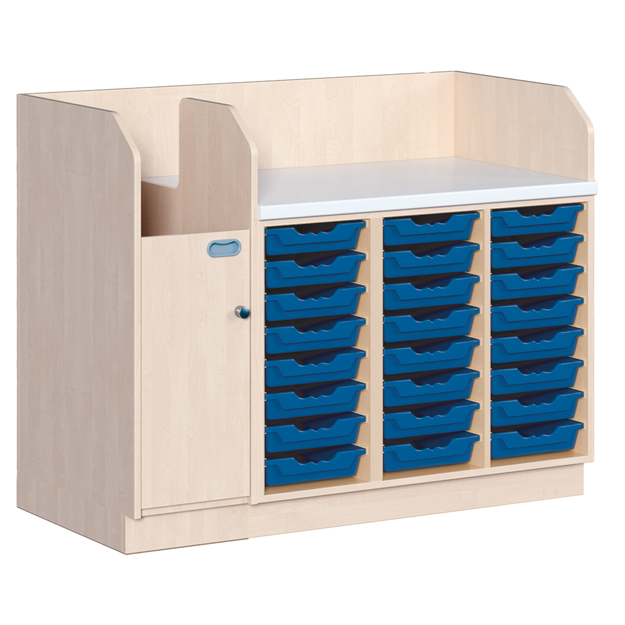 Ob als einzeln aufgestellter Wickelschrank oder als große Wickelkombination - in jedem Fall bieten die verschiedenen Elemente der Wickelkommoden langlebige Materialien, geprüfte Sicherheit, ergonomische Maße und zudem viel Stauraum. Dreiseitige Sicherheits-Aufkantungen umranden die Arbeitsplatte, die vorn benutzerfreundlich gerundet ist und über eine beschichtete und damit wasserabweisende Oberfläche mit zusätzlichen antibakteriellen Eigenschaften verfügt. Eingelassene Griffe und der zurückgesetzte Sockel gestatten ein nahes Herantreten an den Wickelplatz. Als Ausstattungen sind verschiedene Varianten rückenschonender Aufstiegshilfen, Schübe, sowie Kinderbadewannen und Handwaschbecken erhältlich. Optional ist eine besonders wasserfeste Sockelvariante lieferbar. Es kann zwischen zwei verschiedenen Arbeitstiefen und Rechts/Links-Varianten der Schränke gewählt werden. Die Belastbarkeit beträgt bis zu 75 kg. Die Wickelauflage ist separat zu bestellen (Art.Nr. "WIC P..." in der jeweiligen Breite und Tiefe).
