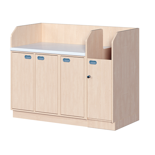Ob als einzeln aufgestellter Wickelschrank oder als große Wickelkombination - in jedem Fall bieten die verschiedenen Elemente der Wickelkommoden langlebige Materialien, geprüfte Sicherheit, ergonomische Maße und zudem viel Stauraum. Dreiseitige Sicherheits-Aufkantungen umranden die Arbeitsplatte, die vorn benutzerfreundlich gerundet ist und über eine beschichtete und damit wasserabweisende Oberfläche mit zusätzlichen antibakteriellen Eigenschaften verfügt. Eingelassene Griffe und der zurückgesetzte Sockel gestatten ein nahes Herantreten an den Wickelplatz. Als Ausstattungen sind verschiedene Varianten rückenschonender Aufstiegshilfen, Schübe, sowie Kinderbadewannen und Handwaschbecken erhältlich. Optional ist eine besonders wasserfeste Sockelvariante lieferbar. Es kann zwischen zwei verschiedenen Arbeitstiefen und Rechts/Links-Varianten der Schränke gewählt werden. Die Belastbarkeit beträgt bis zu 75 kg. Die Wickelauflage ist separat zu bestellen (Art.Nr. "WIC P..." in der jeweiligen Breite und Tiefe).