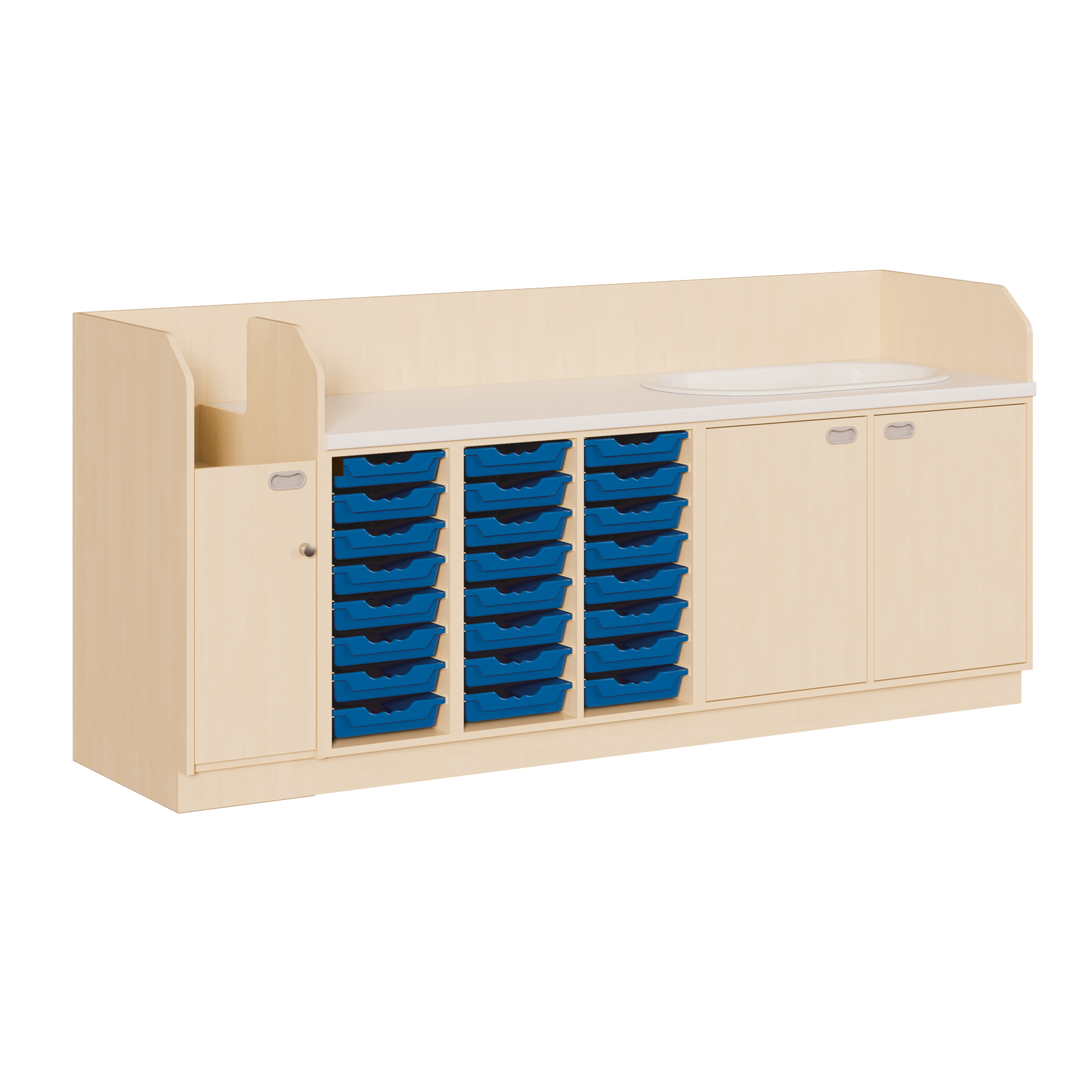 Ob als einzeln aufgestellter Wickelschrank oder als große Wickelkombination - in jedem Fall bieten die verschiedenen Elemente der Wickelkommoden langlebige Materialien, geprüfte Sicherheit, ergonomische Maße und zudem viel Stauraum. Dreiseitige Sicherheits-Aufkantungen umranden die Arbeitsplatte, die vorn benutzerfreundlich gerundet ist und über eine beschichtete und damit wasserabweisende Oberfläche mit zusätzlichen antibakteriellen Eigenschaften verfügt. Eingelassene Griffe und der zurückgesetzte Sockel gestatten ein nahes Herantreten an den Wickelplatz. Als Ausstattungen sind verschiedene Varianten rückenschonender Aufstiegshilfen, Schübe, sowie Kinderbadewannen und Handwaschbecken erhältlich. Optional ist eine besonders wasserfeste Sockelvariante lieferbar. Es kann zwischen zwei verschiedenen Arbeitstiefen und Rechts/Links-Varianten der Schränke gewählt werden. Die Belastbarkeit beträgt bis zu 75 kg. Die Wickelauflage ist separat zu bestellen (Art.Nr. "WIC P..." in der jeweiligen Breite und Tiefe). Ebenso ist bei der Bestellung die gewünschte Ausführung der Einhebel-Mischbatterie - schwenkbare oder herausnehmbare Ausführung - (Art.Nr. "KG 02...") zusätzlich zu vermerken.