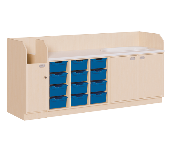 Ob als einzeln aufgestellter Wickelschrank oder als große Wickelkombination - in jedem Fall bieten die verschiedenen Elemente der Wickelkommoden langlebige Materialien, geprüfte Sicherheit, ergonomische Maße und zudem viel Stauraum. Dreiseitige Sicherheits-Aufkantungen umranden die Arbeitsplatte, die vorn benutzerfreundlich gerundet ist und über eine beschichtete und damit wasserabweisende Oberfläche mit zusätzlichen antibakteriellen Eigenschaften verfügt. Eingelassene Griffe und der zurückgesetzte Sockel gestatten ein nahes Herantreten an den Wickelplatz. Als Ausstattungen sind verschiedene Varianten rückenschonender Aufstiegshilfen, Schübe, sowie Kinderbadewannen und Handwaschbecken erhältlich. Optional ist eine besonders wasserfeste Sockelvariante lieferbar. Es kann zwischen zwei verschiedenen Arbeitstiefen und Rechts/Links-Varianten der Schränke gewählt werden. Die Belastbarkeit beträgt bis zu 75 kg. Die Wickelauflage ist separat zu bestellen (Art.Nr. "WIC P..." in der jeweiligen Breite und Tiefe). Ebenso ist bei der Bestellung die gewünschte Ausführung der Einhebel-Mischbatterie - schwenkbare oder herausnehmbare Ausführung - (Art.Nr. "KG 02...") zusätzlich zu vermerken.