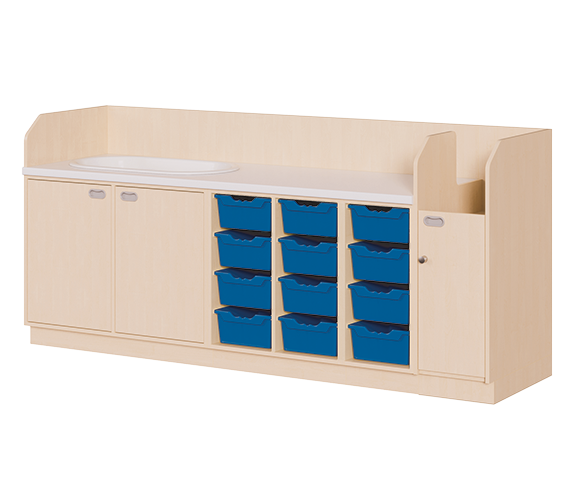 Ob als einzeln aufgestellter Wickelschrank oder als große Wickelkombination - in jedem Fall bieten die verschiedenen Elemente der Wickelkommoden langlebige Materialien, geprüfte Sicherheit, ergonomische Maße und zudem viel Stauraum. Dreiseitige Sicherheits-Aufkantungen umranden die Arbeitsplatte, die vorn benutzerfreundlich gerundet ist und über eine beschichtete und damit wasserabweisende Oberfläche mit zusätzlichen antibakteriellen Eigenschaften verfügt. Eingelassene Griffe und der zurückgesetzte Sockel gestatten ein nahes Herantreten an den Wickelplatz. Als Ausstattungen sind verschiedene Varianten rückenschonender Aufstiegshilfen, Schübe, sowie Kinderbadewannen und Handwaschbecken erhältlich. Optional ist eine besonders wasserfeste Sockelvariante lieferbar. Es kann zwischen zwei verschiedenen Arbeitstiefen und Rechts/Links-Varianten der Schränke gewählt werden. Die Belastbarkeit beträgt bis zu 75 kg. Die Wickelauflage ist separat zu bestellen (Art.Nr. "WIC P..." in der jeweiligen Breite und Tiefe). Ebenso ist bei der Bestellung die gewünschte Ausführung der Einhebel-Mischbatterie - schwenkbare oder herausnehmbare Ausführung - (Art.Nr. "KG 02...") zusätzlich zu vermerken.