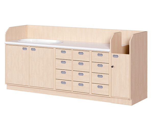 Ob als einzeln aufgestellter Wickelschrank oder als große Wickelkombination - in jedem Fall bieten die verschiedenen Elemente der Wickelkommoden langlebige Materialien, geprüfte Sicherheit, ergonomische Maße und zudem viel Stauraum. Dreiseitige Sicherheits-Aufkantungen umranden die Arbeitsplatte, die vorn benutzerfreundlich gerundet ist und über eine beschichtete und damit wasserabweisende Oberfläche mit zusätzlichen antibakteriellen Eigenschaften verfügt. Eingelassene Griffe und der zurückgesetzte Sockel gestatten ein nahes Herantreten an den Wickelplatz. Als Ausstattungen sind verschiedene Varianten rückenschonender Aufstiegshilfen, Schübe, sowie Kinderbadewannen und Handwaschbecken erhältlich. Optional ist eine besonders wasserfeste Sockelvariante lieferbar. Es kann zwischen zwei verschiedenen Arbeitstiefen und Rechts/Links-Varianten der Schränke gewählt werden. Die Belastbarkeit beträgt bis zu 75 kg. Die Wickelauflage ist separat zu bestellen (Art.Nr. "WIC P..." in der jeweiligen Breite und Tiefe). Ebenso ist bei der Bestellung die gewünschte Ausführung der Einhebel-Mischbatterie - schwenkbare oder herausnehmbare Ausführung - (Art.Nr. "KG 02...") zusätzlich zu vermerken.