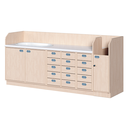 Ob als einzeln aufgestellter Wickelschrank oder als große Wickelkombination - in jedem Fall bieten die verschiedenen Elemente der Wickelkommoden langlebige Materialien, geprüfte Sicherheit, ergonomische Maße und zudem viel Stauraum. Dreiseitige Sicherheits-Aufkantungen umranden die Arbeitsplatte, die vorn benutzerfreundlich gerundet ist und über eine beschichtete und damit wasserabweisende Oberfläche mit zusätzlichen antibakteriellen Eigenschaften verfügt. Eingelassene Griffe und der zurückgesetzte Sockel gestatten ein nahes Herantreten an den Wickelplatz. Als Ausstattungen sind verschiedene Varianten rückenschonender Aufstiegshilfen, Schübe, sowie Kinderbadewannen und Handwaschbecken erhältlich. Optional ist eine besonders wasserfeste Sockelvariante lieferbar. Es kann zwischen zwei verschiedenen Arbeitstiefen und Rechts/Links-Varianten der Schränke gewählt werden. Die Belastbarkeit beträgt bis zu 75 kg. Die Wickelauflage ist separat zu bestellen (Art.Nr. "WIC P..." in der jeweiligen Breite und Tiefe). Ebenso ist bei der Bestellung die gewünschte Ausführung der Einhebel-Mischbatterie - schwenkbare oder herausnehmbare Ausführung - (Art.Nr. "KG 02...") zusätzlich zu vermerken.