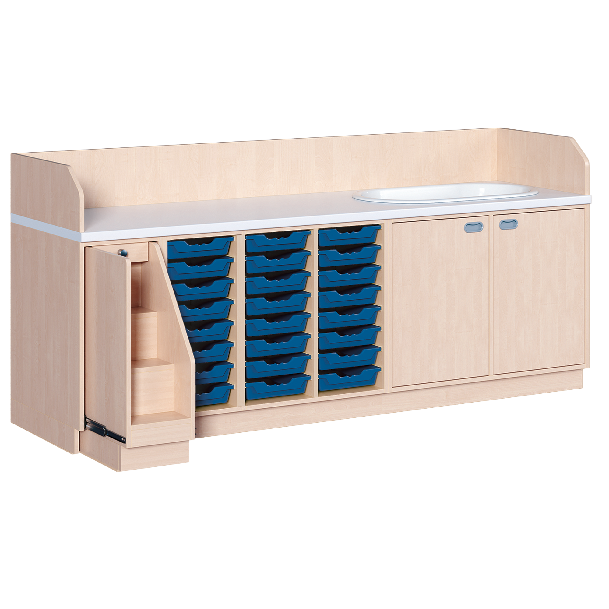 Ob als einzeln aufgestellter Wickelschrank oder als große Wickelkombination - in jedem Fall bieten die verschiedenen Elemente der Wickelkommoden langlebige Materialien, geprüfte Sicherheit, ergonomische Maße und zudem viel Stauraum. Dreiseitige Sicherheits-Aufkantungen umranden die Arbeitsplatte, die vorn benutzerfreundlich gerundet ist und über eine beschichtete und damit wasserabweisende Oberfläche mit zusätzlichen antibakteriellen Eigenschaften verfügt. Eingelassene Griffe und der zurückgesetzte Sockel gestatten ein nahes Herantreten an den Wickelplatz. Als Ausstattungen sind verschiedene Varianten rückenschonender Aufstiegshilfen, Schübe, sowie Kinderbadewannen und Handwaschbecken erhältlich. Optional ist eine besonders wasserfeste Sockelvariante lieferbar. Es kann zwischen zwei verschiedenen Arbeitstiefen und Rechts/Links-Varianten der Schränke gewählt werden. Die Belastbarkeit beträgt bis zu 75 kg. Die Wickelauflage ist separat zu bestellen (Art.Nr. "WIC P..." in der jeweiligen Breite und Tiefe). Ebenso ist bei der Bestellung die gewünschte Ausführung der Einhebel-Mischbatterie - schwenkbare oder herausnehmbare Ausführung - (Art.Nr. "KG 02...") zusätzlich zu vermerken.