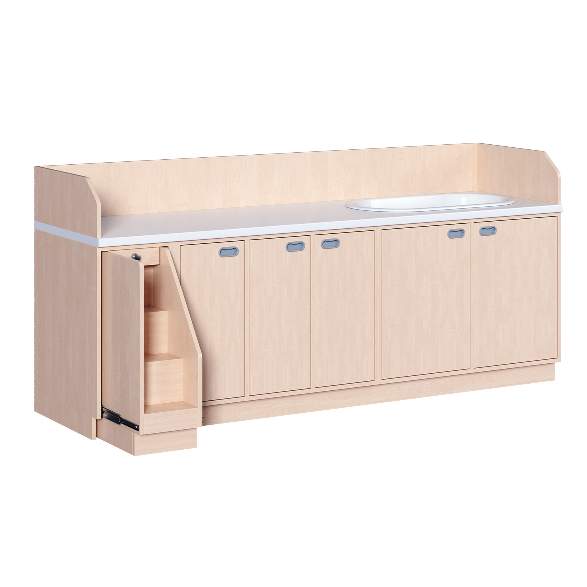 Ob als einzeln aufgestellter Wickelschrank oder als große Wickelkombination - in jedem Fall bieten die verschiedenen Elemente der Wickelkommoden langlebige Materialien, geprüfte Sicherheit, ergonomische Maße und zudem viel Stauraum. Dreiseitige Sicherheits-Aufkantungen umranden die Arbeitsplatte, die vorn benutzerfreundlich gerundet ist und über eine beschichtete und damit wasserabweisende Oberfläche mit zusätzlichen antibakteriellen Eigenschaften verfügt. Eingelassene Griffe und der zurückgesetzte Sockel gestatten ein nahes Herantreten an den Wickelplatz. Als Ausstattungen sind verschiedene Varianten rückenschonender Aufstiegshilfen, Schübe, sowie Kinderbadewannen und Handwaschbecken erhältlich. Optional ist eine besonders wasserfeste Sockelvariante lieferbar. Es kann zwischen zwei verschiedenen Arbeitstiefen und Rechts/Links-Varianten der Schränke gewählt werden. Die Belastbarkeit beträgt bis zu 75 kg. Die Wickelauflage ist separat zu bestellen (Art.Nr. "WIC P..." in der jeweiligen Breite und Tiefe). Ebenso ist bei der Bestellung die gewünschte Ausführung der Einhebel-Mischbatterie - schwenkbare oder herausnehmbare Ausführung - (Art.Nr. "KG 02...") zusätzlich zu vermerken.