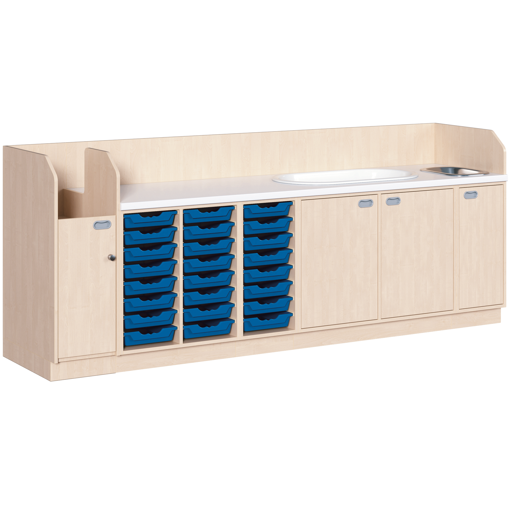 Ob als einzeln aufgestellter Wickelschrank oder als große Wickelkombination - in jedem Fall bieten die verschiedenen Elemente der Wickelkommoden langlebige Materialien, geprüfte Sicherheit, ergonomische Maße und zudem viel Stauraum. Dreiseitige Sicherheits-Aufkantungen umranden die Arbeitsplatte, die vorn benutzerfreundlich gerundet ist und über eine beschichtete und damit wasserabweisende Oberfläche mit zusätzlichen antibakteriellen Eigenschaften verfügt. Eingelassene Griffe und der zurückgesetzte Sockel gestatten ein nahes Herantreten an den Wickelplatz. Als Ausstattungen sind verschiedene Varianten rückenschonender Aufstiegshilfen, Schübe, sowie Kinderbadewannen und Handwaschbecken erhältlich. Optional ist eine besonders wasserfeste Sockelvariante lieferbar. Es kann zwischen zwei verschiedenen Arbeitstiefen und Rechts/Links-Varianten der Schränke gewählt werden. Die Belastbarkeit beträgt bis zu 75 kg. Die Wickelauflage ist separat zu bestellen (Art.Nr. "WIC P..." in der jeweiligen Breite und Tiefe). Ebenso ist bei der Bestellung die gewünschte Ausführung der Einhebel-Mischbatterie - schwenkbare oder herausnehmbare Ausführung - (Art.Nr. "KG 02...") zusätzlich zu vermerken.