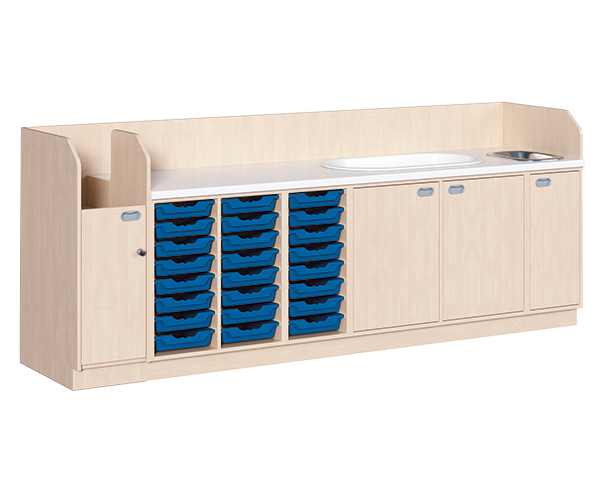 Ob als einzeln aufgestellter Wickelschrank oder als große Wickelkombination - in jedem Fall bieten die verschiedenen Elemente der Wickelkommoden langlebige Materialien, geprüfte Sicherheit, ergonomische Maße und zudem viel Stauraum. Dreiseitige Sicherheits-Aufkantungen umranden die Arbeitsplatte, die vorn benutzerfreundlich gerundet ist und über eine beschichtete und damit wasserabweisende Oberfläche mit zusätzlichen antibakteriellen Eigenschaften verfügt. Eingelassene Griffe und der zurückgesetzte Sockel gestatten ein nahes Herantreten an den Wickelplatz. Als Ausstattungen sind verschiedene Varianten rückenschonender Aufstiegshilfen, Schübe, sowie Kinderbadewannen und Handwaschbecken erhältlich. Optional ist eine besonders wasserfeste Sockelvariante lieferbar. Es kann zwischen zwei verschiedenen Arbeitstiefen und Rechts/Links-Varianten der Schränke gewählt werden. Die Belastbarkeit beträgt bis zu 75 kg. Die Wickelauflage ist separat zu bestellen (Art.Nr. "WIC P..." in der jeweiligen Breite und Tiefe). Ebenso ist bei der Bestellung die gewünschte Ausführung der Einhebel-Mischbatterie - schwenkbare oder herausnehmbare Ausführung - (Art.Nr. "KG 02...") zusätzlich zu vermerken.